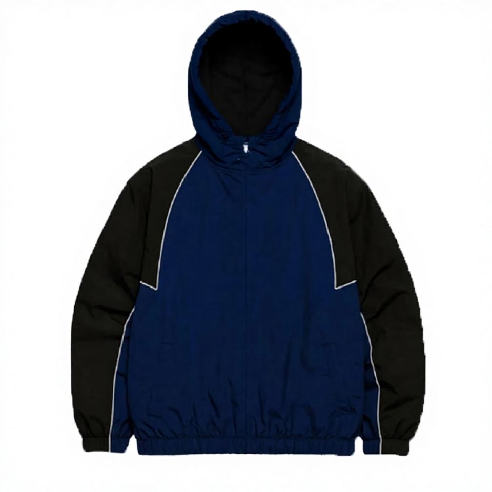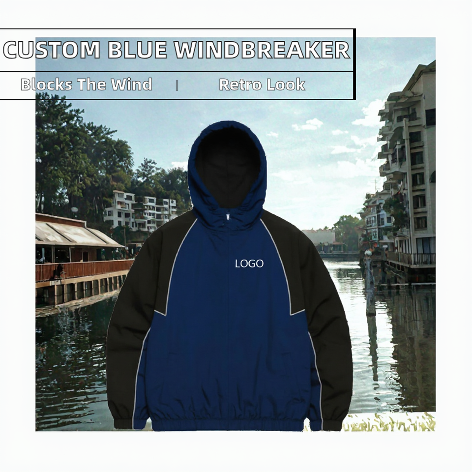 เสื้อแจ็คเก็ตกันลมแบบมีฮู้ดสีน้ำเงินปักโลโก้ตามสั่ง ทรงโอเวอร์ไซส์ หลวม สไตล์เรโทร แอธเลติก วินเทจ ลายบล็อก ดีไซน์สปอร์ต