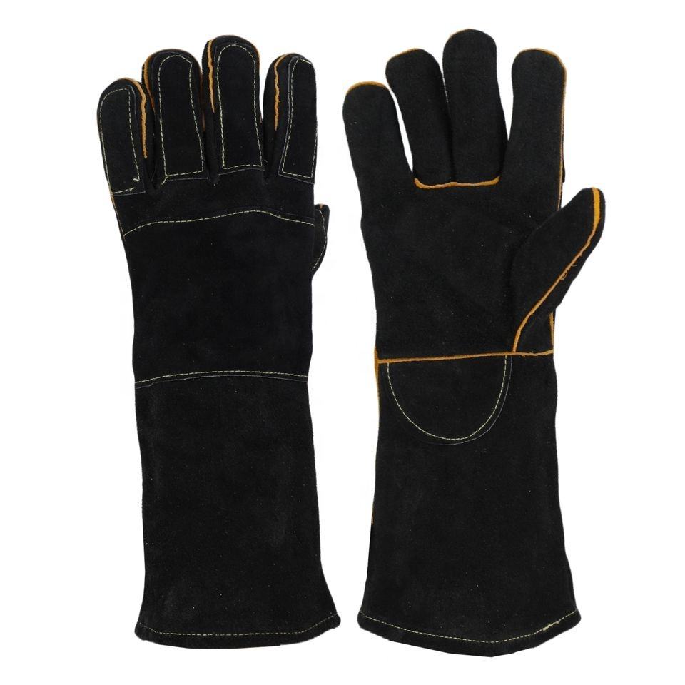 ถุงมืองานเชื่อมหนังวัวสีดำแยกพร้อมโลโก้ออกแบบได้ตามต้องการถุงมือทำงานกลางแจ้งสำหรับเตาบาร์บีคิว