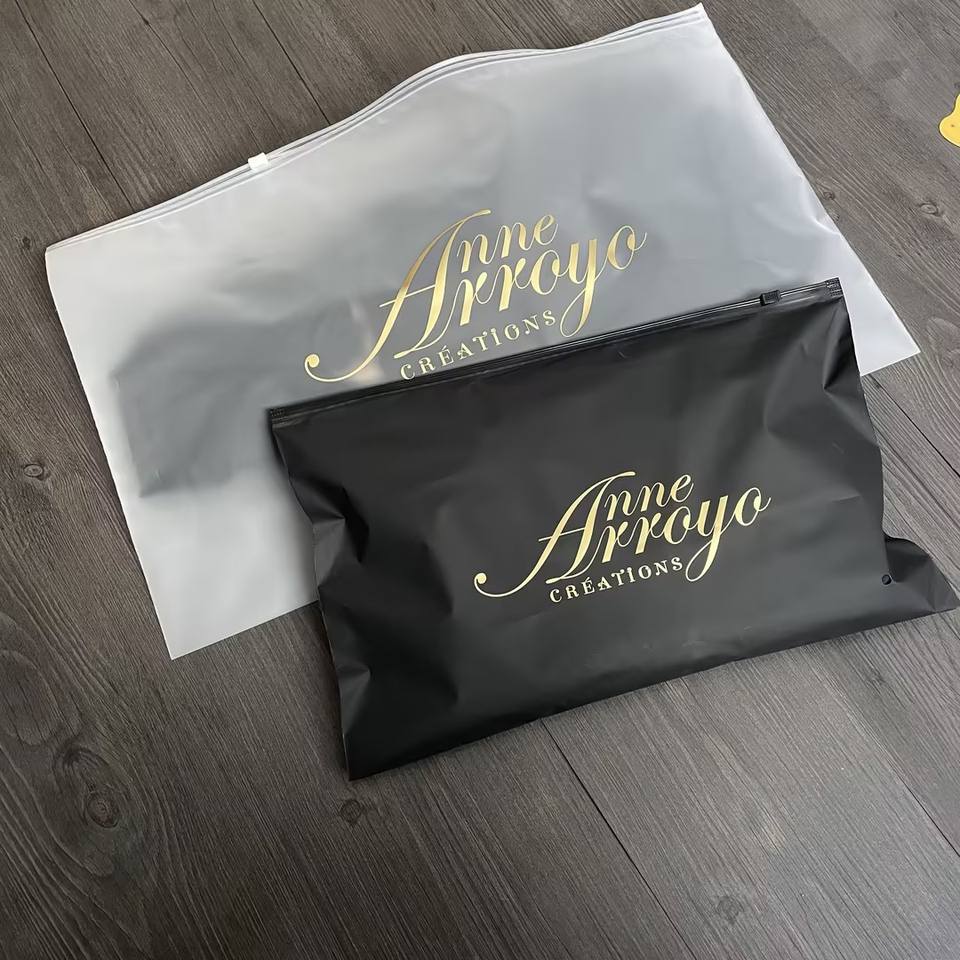 ถุงซิปสีดำด้านพิมพ์โลโก้สีทองตามสั่ง ถุงพลาสติกแบบเป็นมิตรกับสิ่งแวดล้อมสำหรับบรรจุภัณฑ์และจัดเก็บเสื้อผ้าแบรนด์