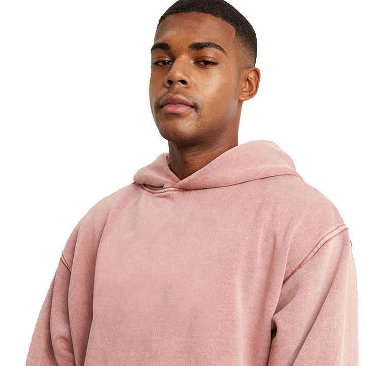 เสื้อมีฮู้ดสำหรับผู้ชายซักกรดสีชมพูแบบวินเทจน้ำหนักมากโลโก้ออกแบบได้ตามต้องการ