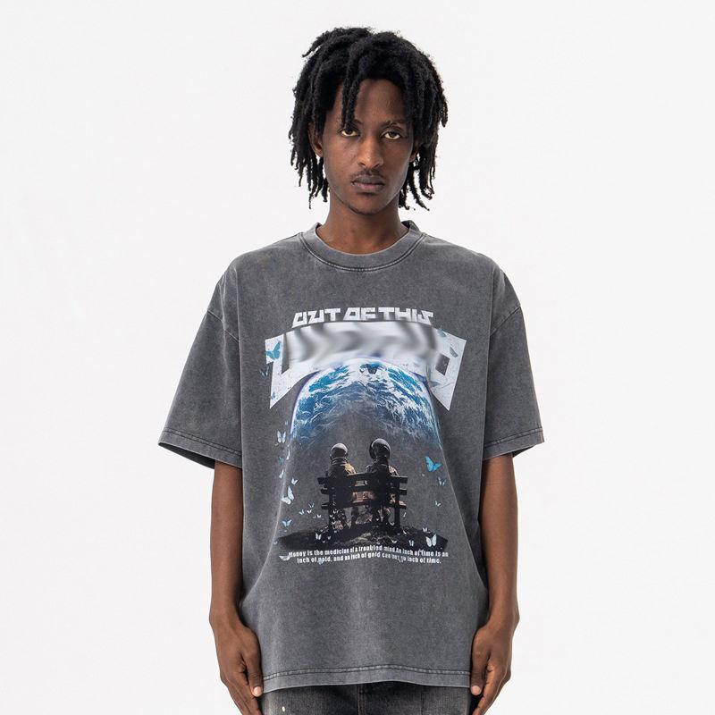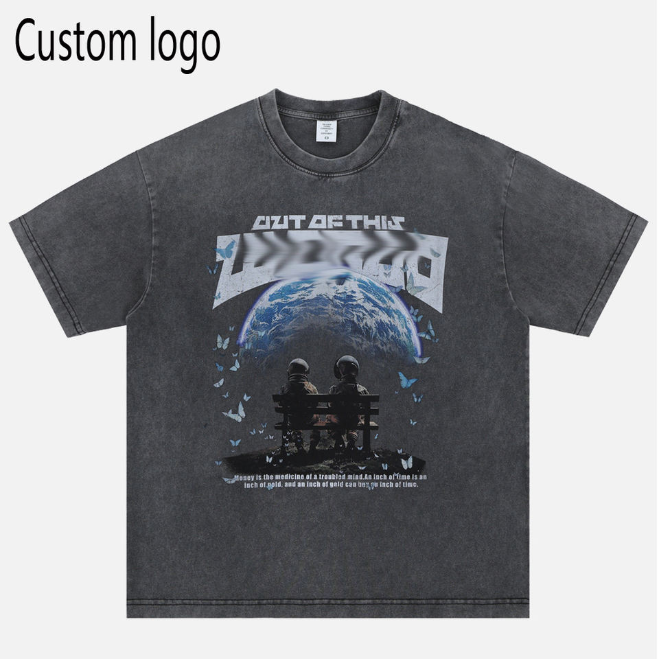 เสื้อยืดผ้าฝ้ายแบบย้อนยุคสำหรับผู้ชายเสื้อยืดลายฮิปฮอปแนวสตรีทเสื้อยืดกราฟิกสำหรับเดินทางโดยจักรวาลน้ำหนัก300กรัมออกแบบโลโก้ได้ตามต้องการ