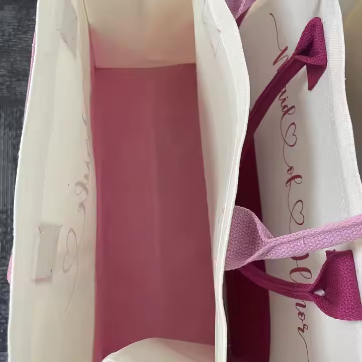 ถุงผ้าแคนวาสแบบกำหนดเองและโลโก้ที่กำหนดเองคุณภาพสูงทนทานแบบเป็นส่วนตัวสำหรับผู้หญิงถุงของขวัญริมชายหาดสีชมพู
