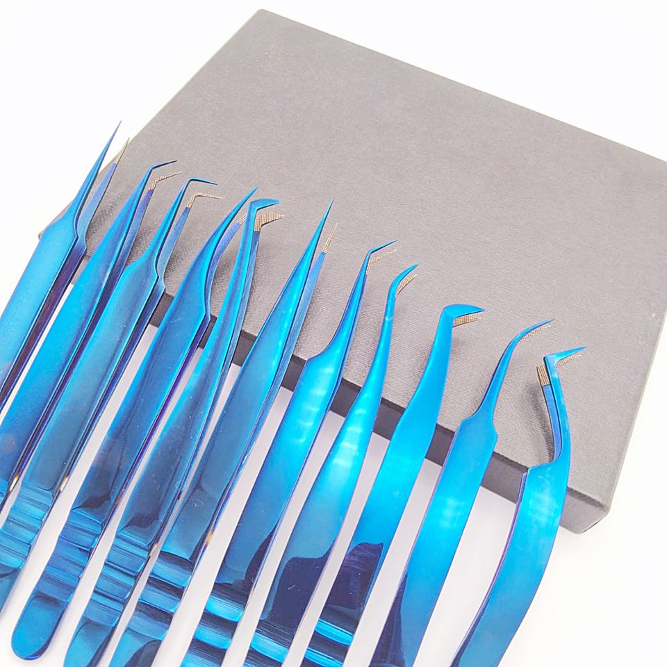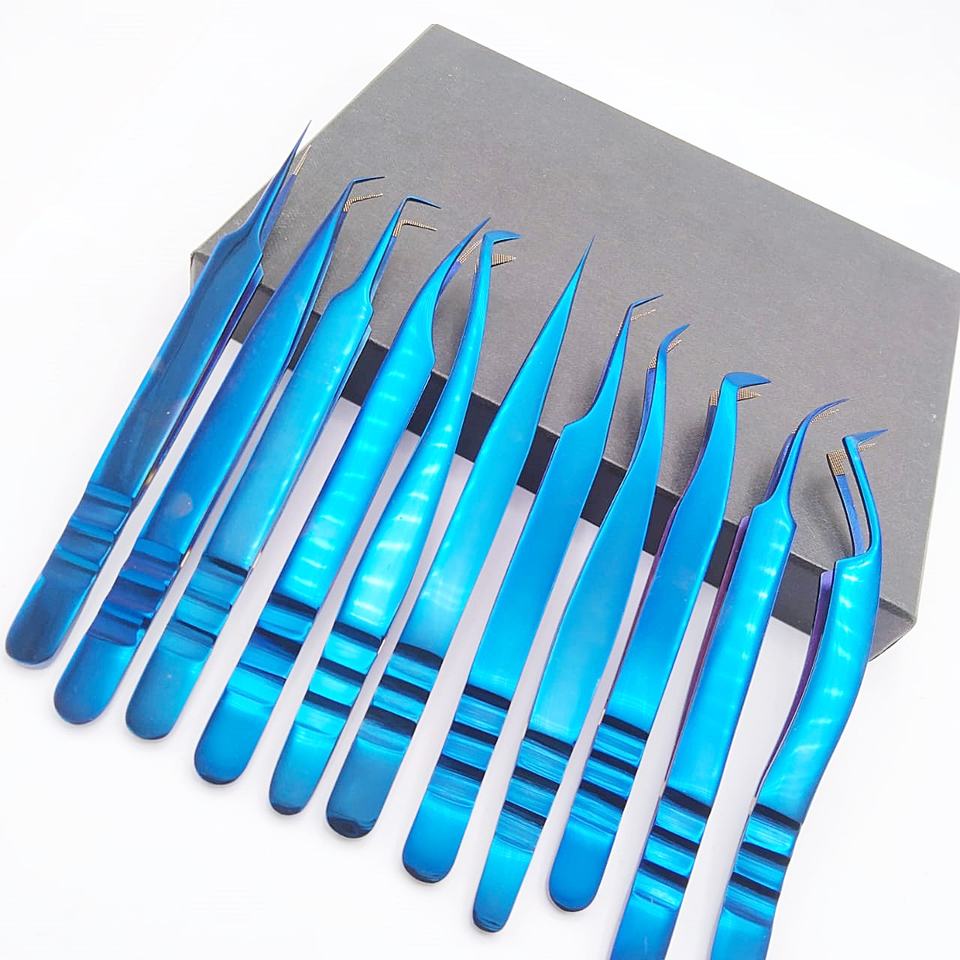 Nomex แหนบต่อขนตาสแตนเลสปลายแหลมไฟเบอร์พลาสม่าสีฟ้า90องศาโลโก้ที่กำหนดเอง