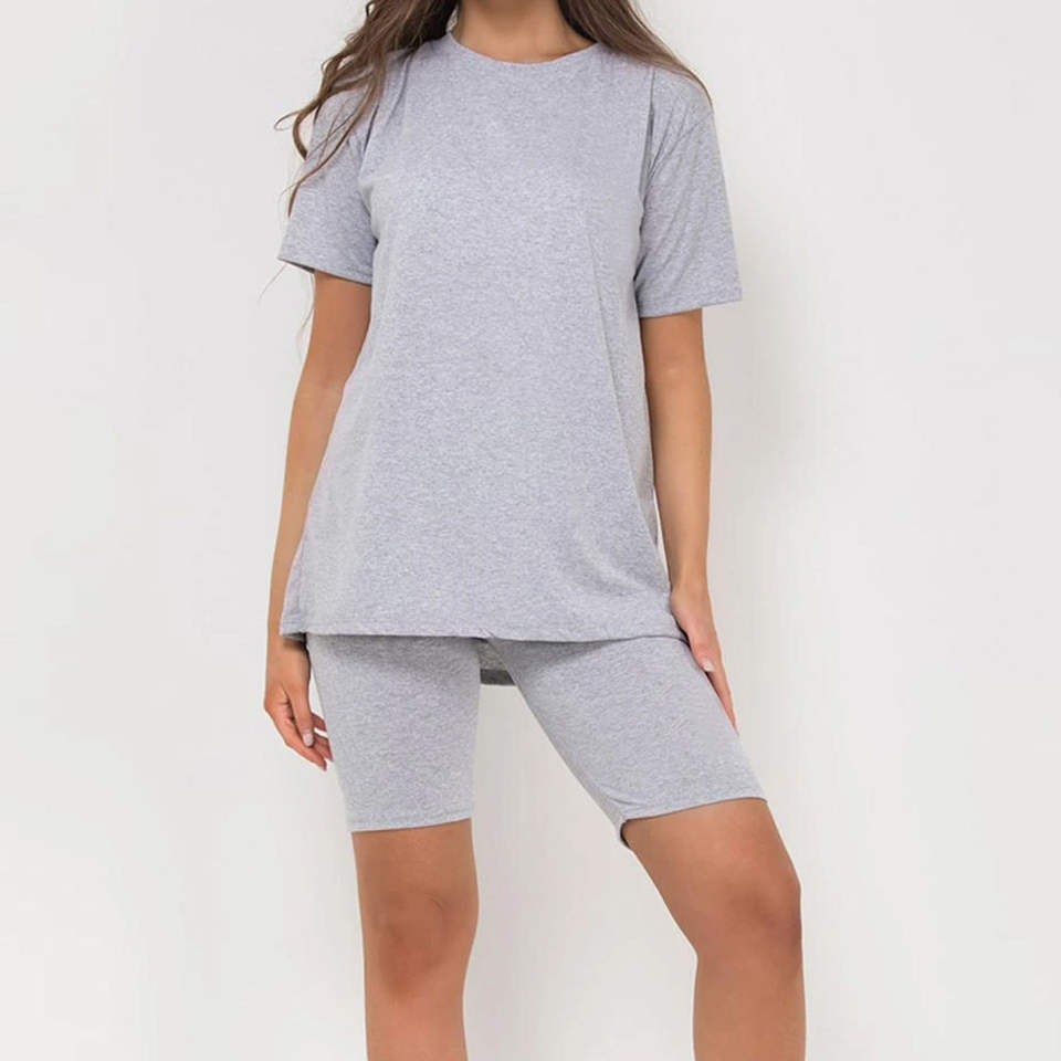 เสื้อยืดแขนสั้นคุณภาพสูงพร้อมกางเกงขาสั้น ชุดเซ็ตคู่สำหรับผู้หญิงใส่หน้าร้อน ลายโลโก้แบบกำหนดเอง ชุดสองชิ้น ผ้าฝ้าย
