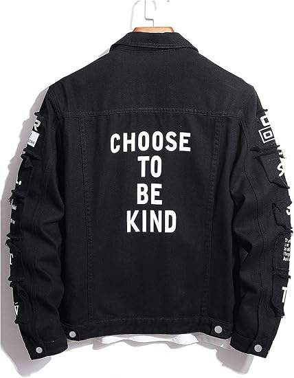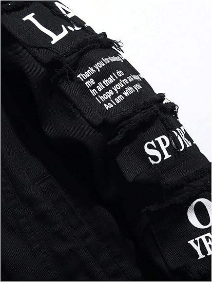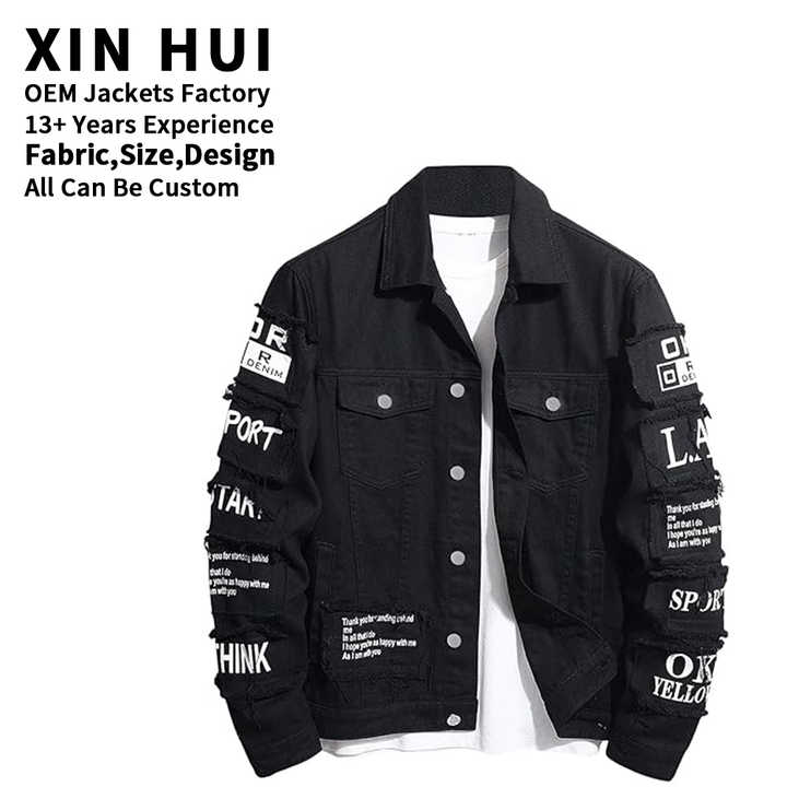เสื้อแจ็คเก็ตยีนส์สีดำสไตล์ฮิปฮอปสำหรับผู้ชาย แต่งลายปะติดขาดๆ พร้อมโลโก้แบบกำหนดเอง เสื้อแจ็คเก็ตยีนส์ผ้าหนาสำหรับผู้ชาย สไตล์วาร์ซิตี้