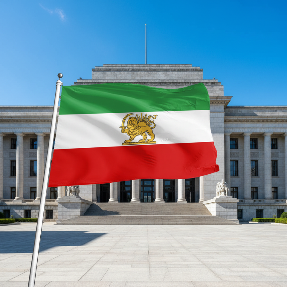 ธงชาติอิหร่านโบราณพร้อมโลโก้สั่งทำ ลายมงกุฎสิงโต ยุคปฏิวัติหลังรัฐธรรมนูญ พร้อมเสาธง