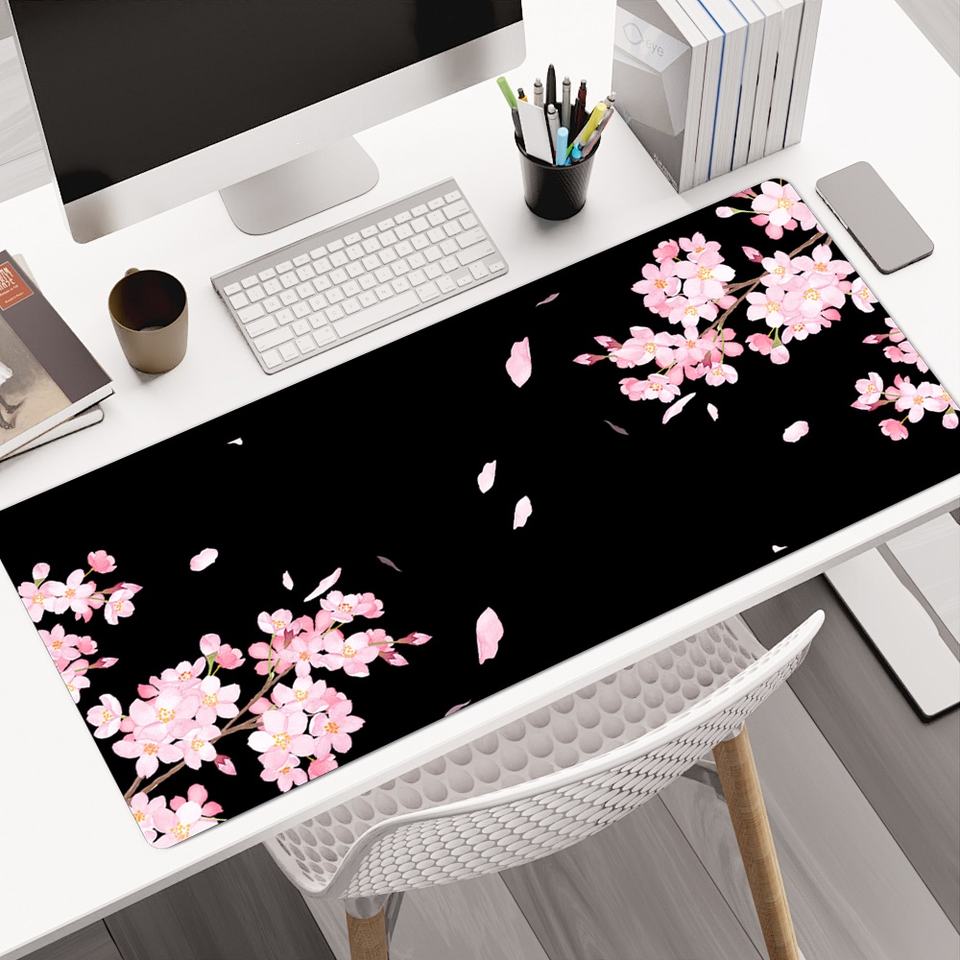 Custom Logo Japanese Cherry Blossom Desk Mat Custom Floral Design Large Gaming Mouse Pad Black Flower Mousepad for Work Office