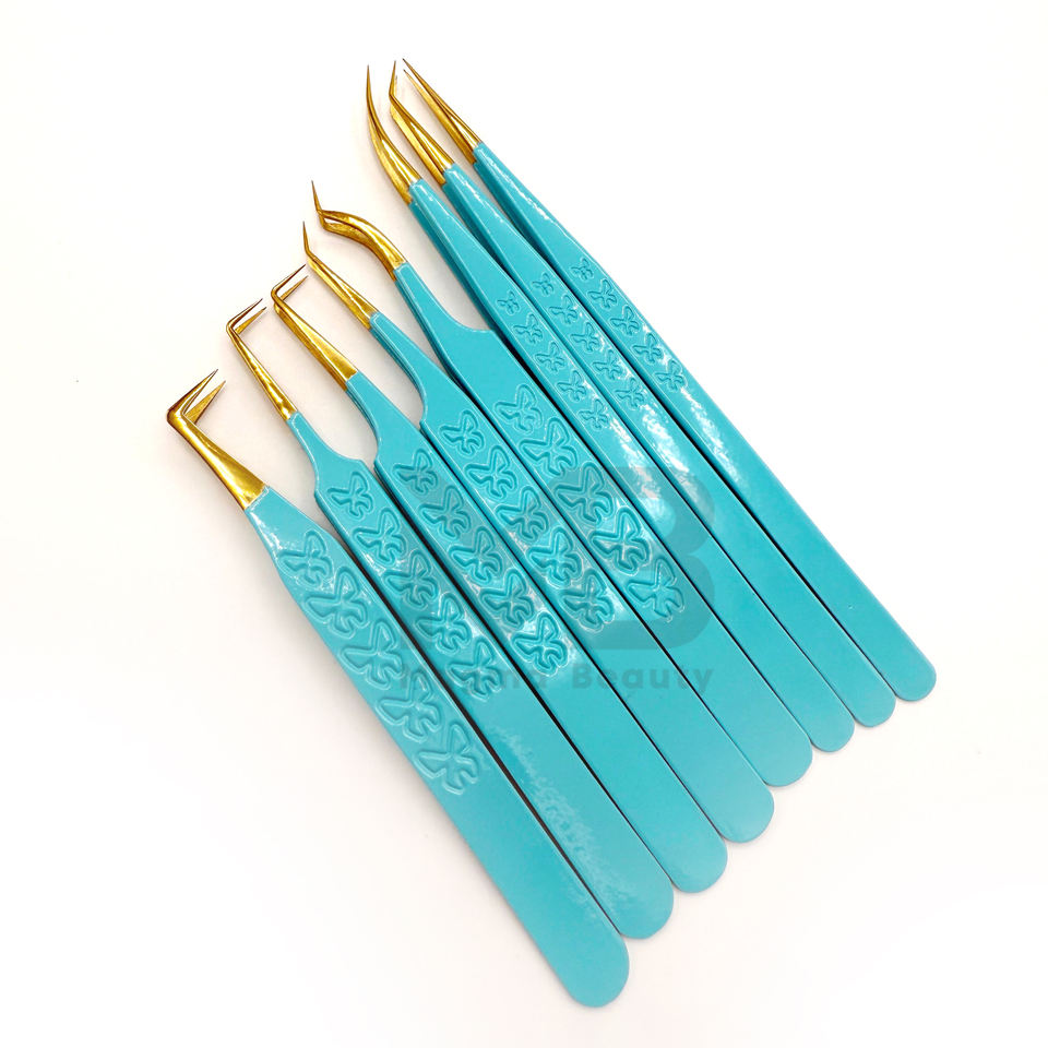 แหนบต่อขนตาปลอมแบบญี่ปุ่นทำจากสเตนเลสปลายแหลมเคลือบสีฟ้าโลโก้ออกแบบได้ตามต้องการ