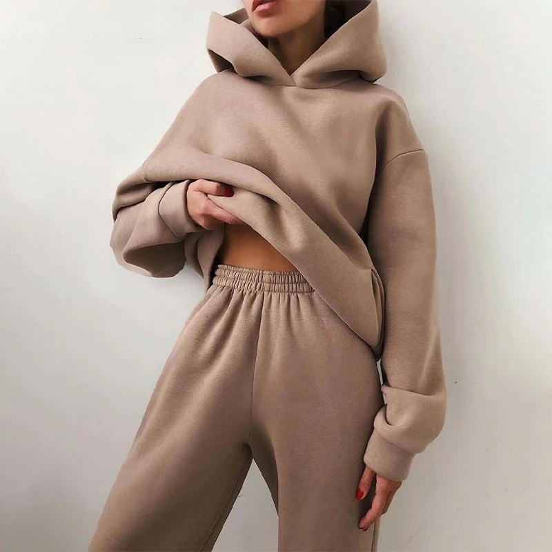 เซ็ตเสื้อวอร์มผ้าฟลีซสำหรับผู้หญิงชุดวิ่งจ๊อกกิ้งเสื้อกันหนาวและกางเกงวิ่งขนแกะสองชิ้นสำหรับผู้หญิงใส่วิ่งสะพายไหล่ออกแบบโลโก้ได้ตามที่ต้องการ