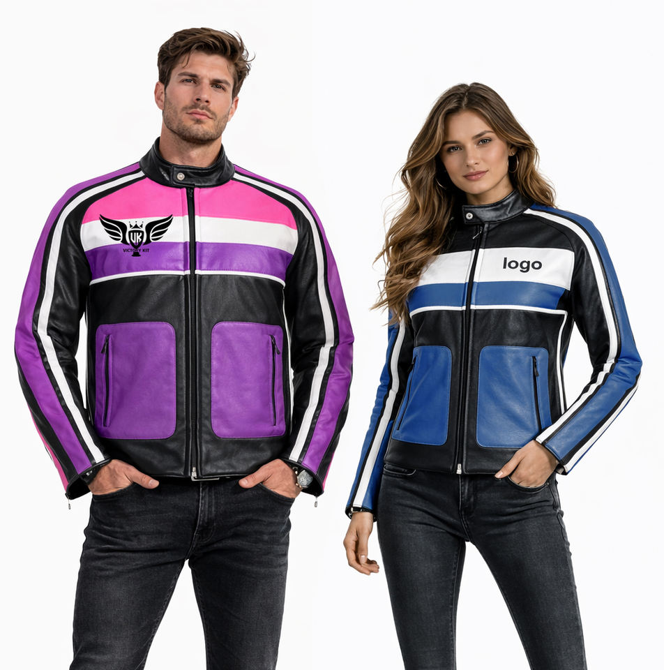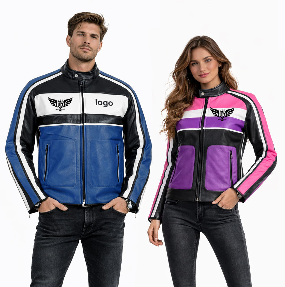แจ็คเก็ตหนังมอเตอร์ไซค์ปักโลโก้ตามสั่ง สำหรับผู้ชายและผู้หญิง แจ็คเก็ตแข่งรถมอเตอร์ไซค์ แจ็คเก็ตมอเตอร์ไซค์แบบ Color Block แจ็คเก็ตหนัง PU OEM เสื้อผ้าสตรีทแวร์