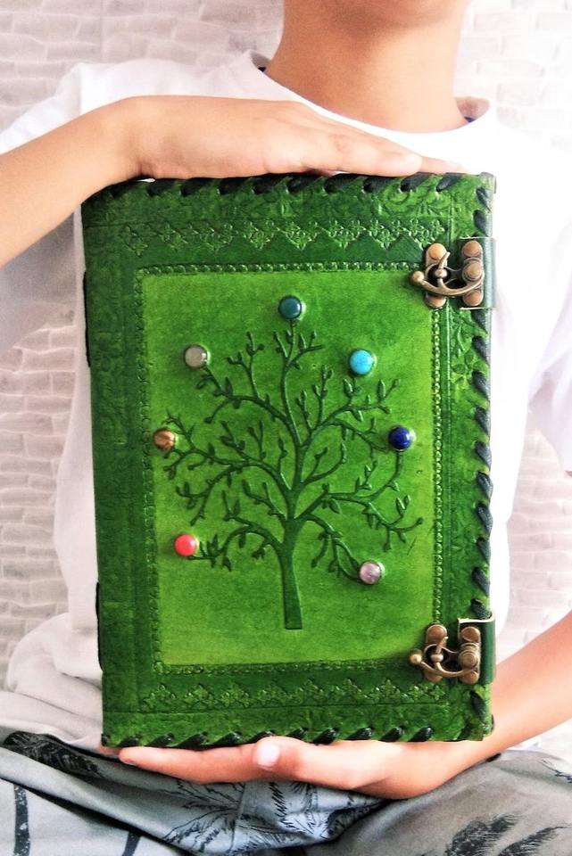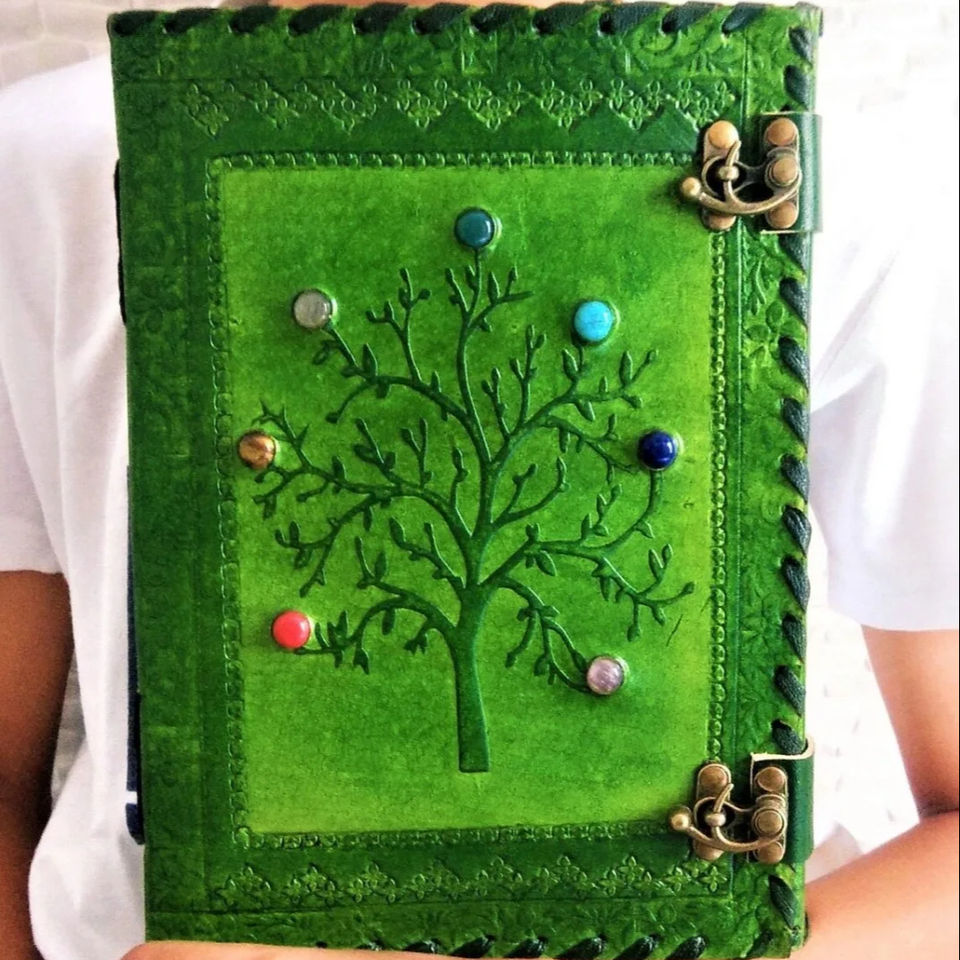 สมุดปกหนังพิมพ์ลายกริมมัวร์สำหรับสมุดโน้ต7หินแบบเกลียวจัดระเบียบด้ายเย็บติดอานลายต้นไม้ของขวัญสไตล์ที่วางแผนไดอารี่