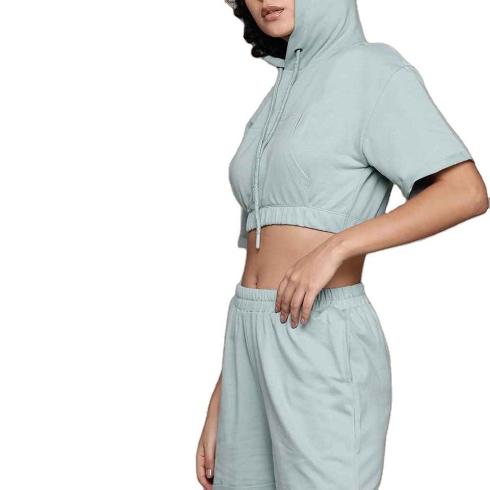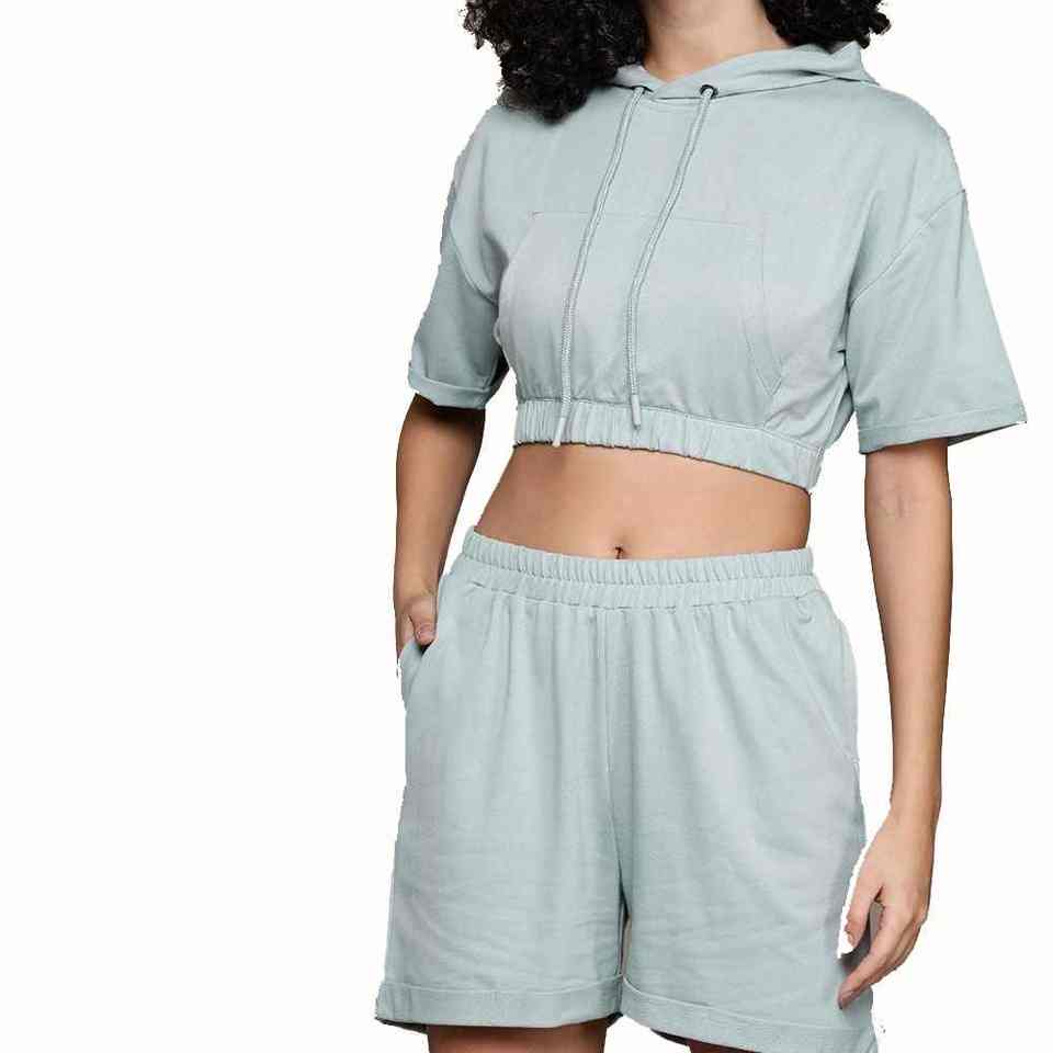 ชุดฮู้ดดี้สไตล์คนเมืองน้ำหนักเบาพร้อมโลโก้แบบกำหนดเอง และชุดกางเกงขาสั้นลำลองสำหรับผู้หญิง ชุดลำลองมีฮู้ดใส่สบายสำหรับผู้หญิง