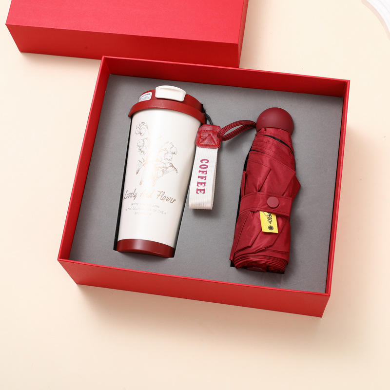 ชุดของขวัญกล่องกระดาษลายดอกลิลลี่พร้อมแก้วกาแฟและร่ม รับทำโลโก้ตามสั่ง เหมาะสำหรับกิจกรรม งานประชุม และเป็นของขวัญสำหรับลูกค้า