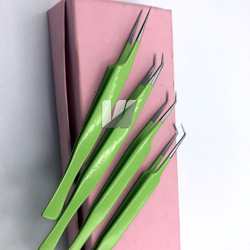 Custom Logo Lime Green Eyelash Extension Tweezers Set Solid Powder Coated Stainless Steel Beauty Instruments High Volume Fiber