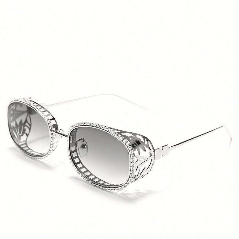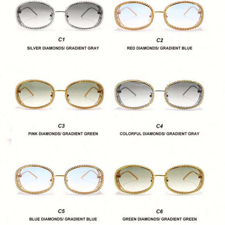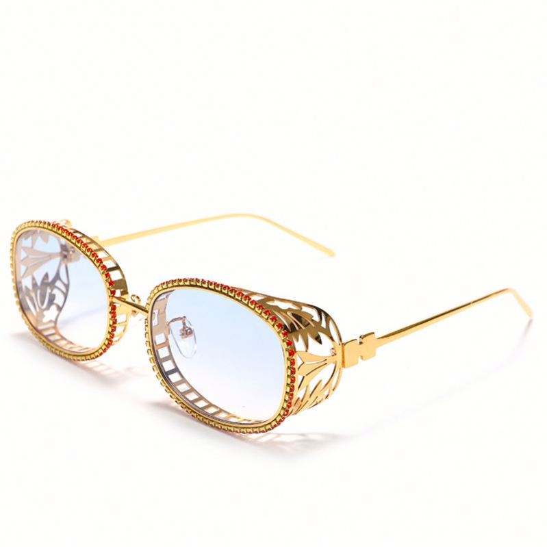 แว่นกันแดดทรงรีสไตล์สตีมพังก์ประดับคริสตัลหรูหราพร้อมกรอบโลหะสลักลายโลโก้แบบกำหนดเองสำหรับผู้หญิง