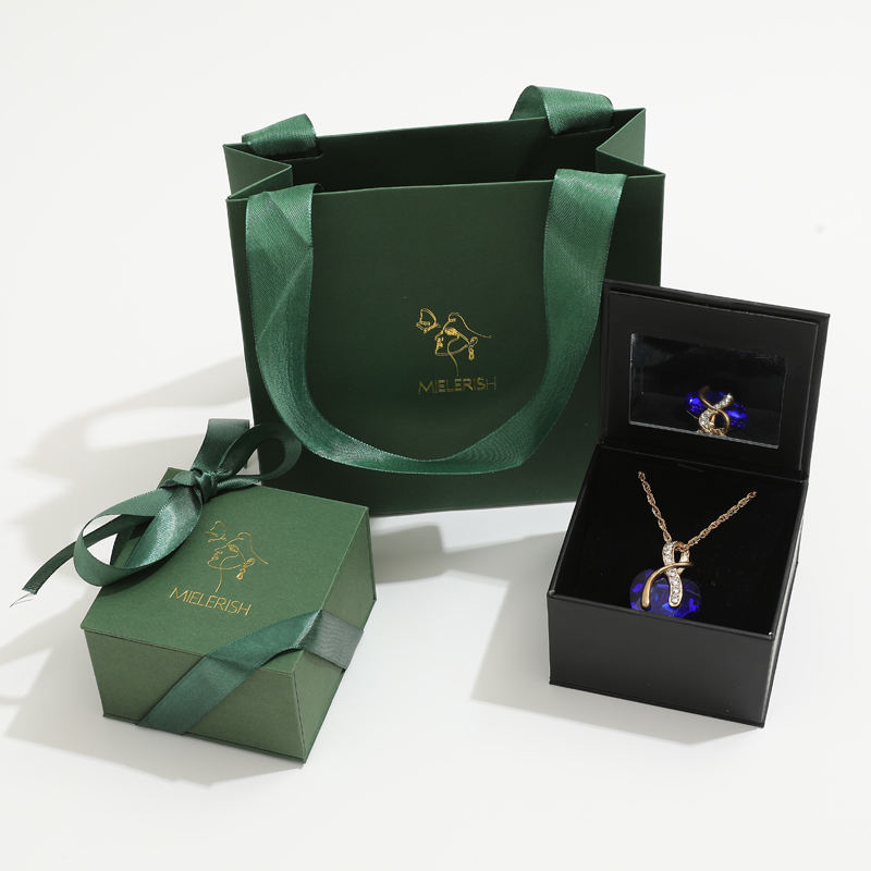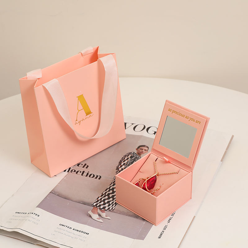 กล่องเครื่องประดับหรูหราพร้อมกระจก พิมพ์โลโก้ได้ บรรจุภัณฑ์กระดาษแข็ง ชุดกระเป๋าถือและของขวัญสำหรับสร้อยคอและแหวน
