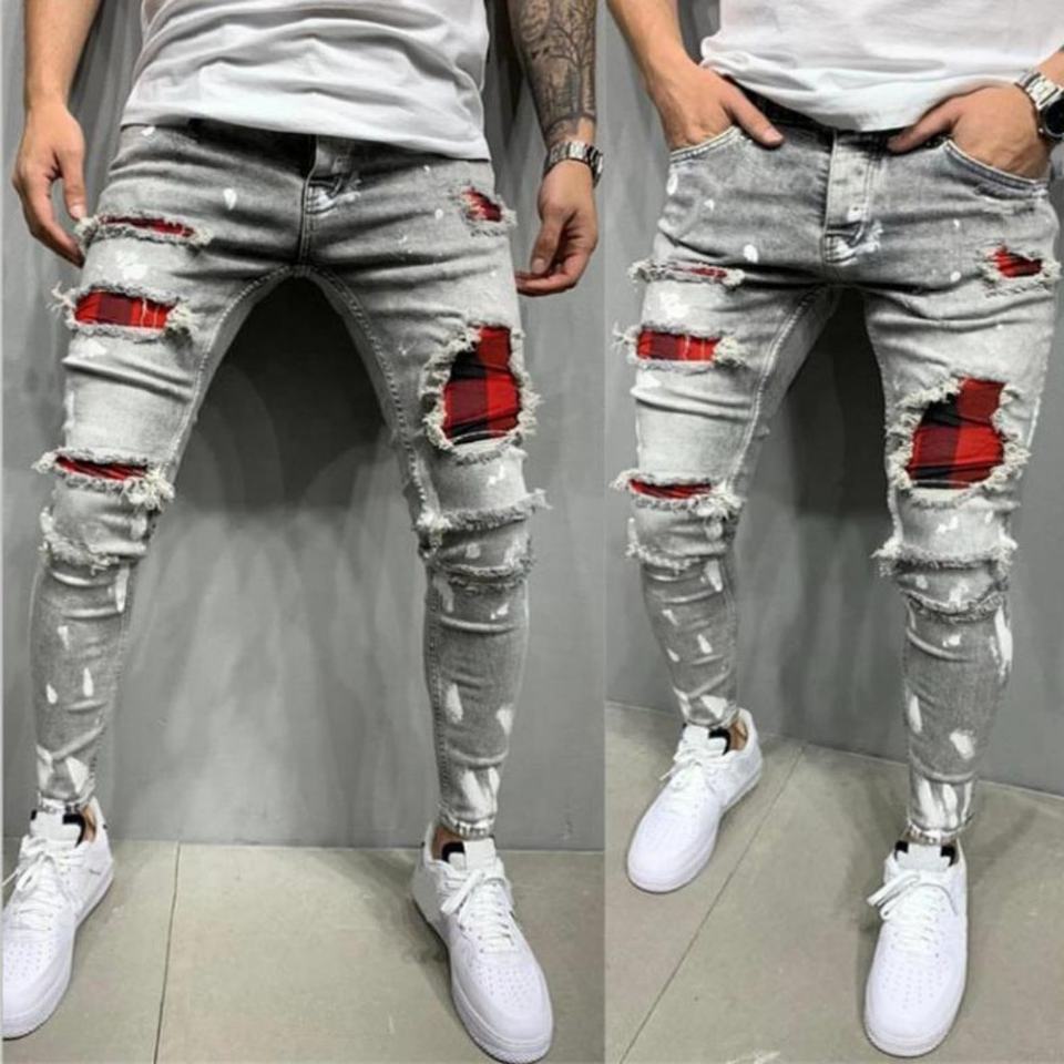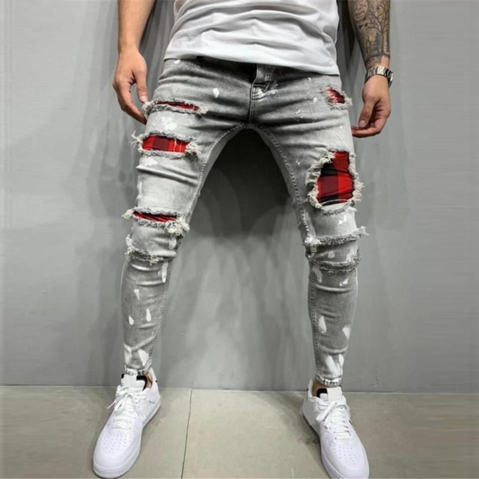 กางเกงยีนส์ผู้ชายโลโก้สั่งทำ ไซส์ใหญ่ ระบายอากาศได้ดี กางเกงยีนส์เจาะรู