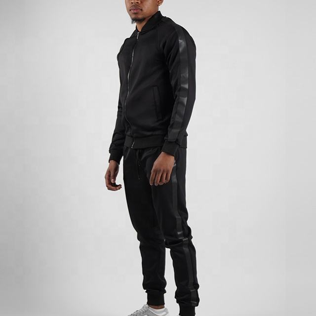 ชุดวอร์มและกางเกงสำหรับผู้ชายชุดวอร์มผ้าโพลีเอสเตอร์สีดำมีซิปสะท้อนแสงโลโก้ออกแบบได้ตามต้องการ
