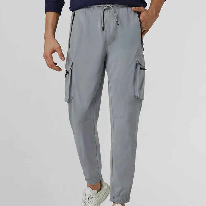 กางเกงจ็อกเกอร์ผู้ชายสีเทาอ่อนแบบแห้งเร็วพิมพ์โลโก้ตามสั่ง ระบายอากาศได้ดี มีกระเป๋าข้างแบบมีซิปและกระเป๋าหลัง