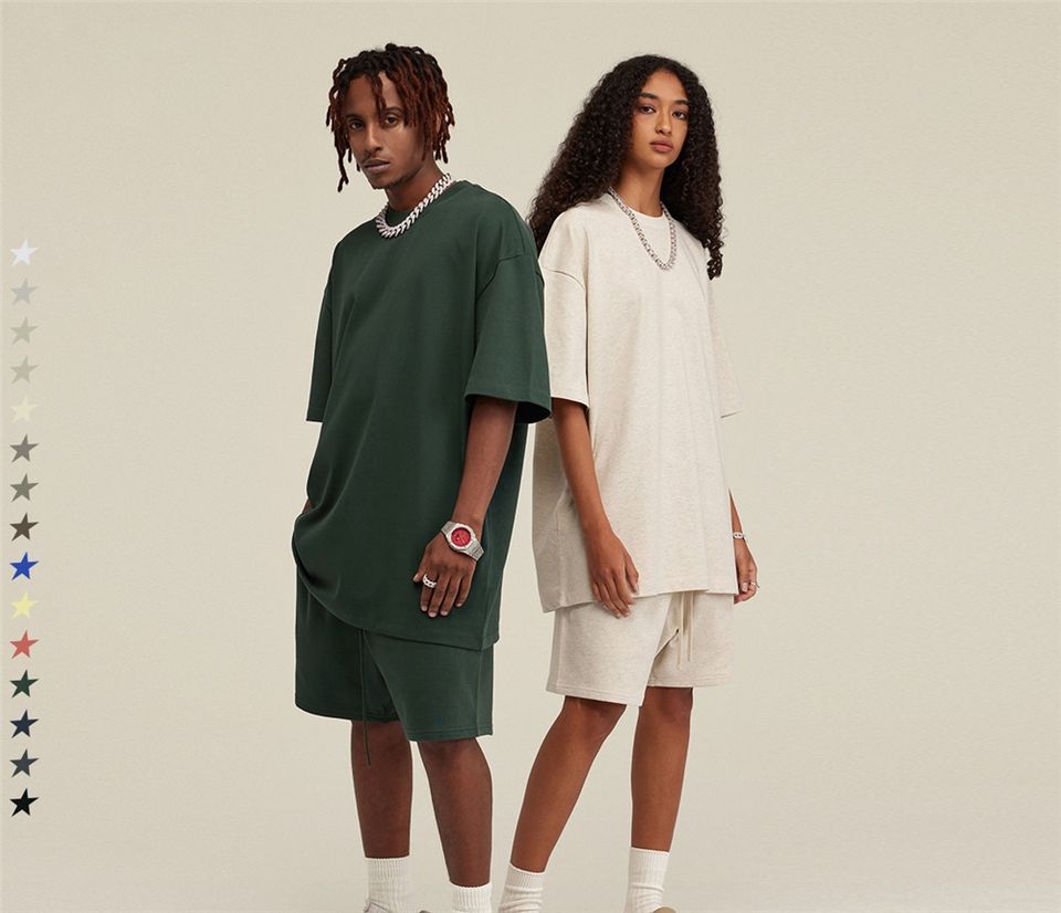 ชุดเซ็ตเสื้อยืดแขนสั้นและกางเกงขาสั้นลำลองผ้าคอตตอน 100% น้ำหนัก 305 กรัม สำหรับผู้ชาย แบรนด์เสื้อผ้าพร้อมโลโก้สั่งทำ ชุดลำลอง 2 ชิ้น