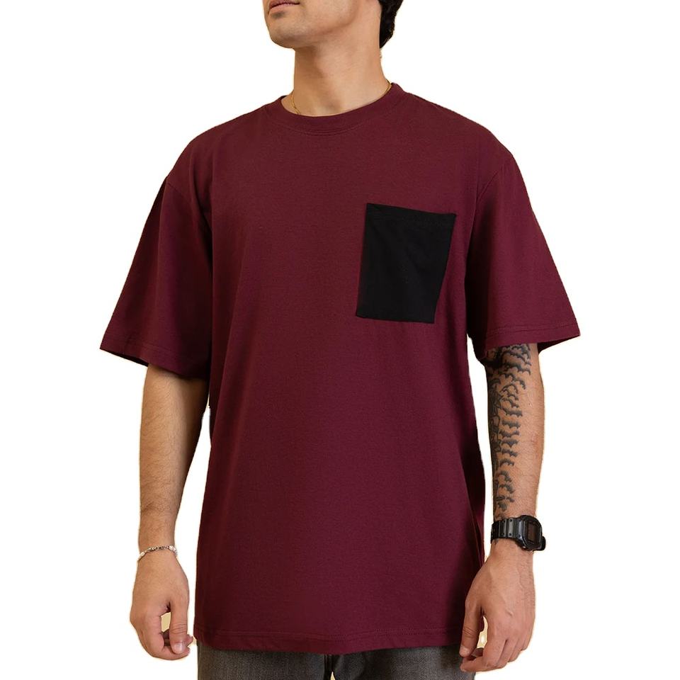 เสื้อยืดคอกลมผ้าคอตตอนหนานุ่มสีเบอร์กันดีสำหรับผู้ชาย พิมพ์โลโก้ตามสั่ง ทรงหลวม แขนสั้น ตัดเย็บแบบสบายๆ สไตล์สตรีทแวร์ พร้อมกระเป๋าตัดสี