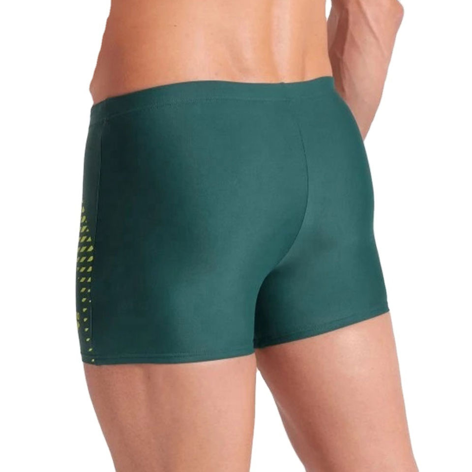 กางเกงว่ายน้ำผู้ชายพิมพ์ลายกราฟิกสีเขียว โลโก้สั่งทำได้ ผ้าสเตรช ใส่ได้ทั้งชายหาดและสระว่ายน้ำ