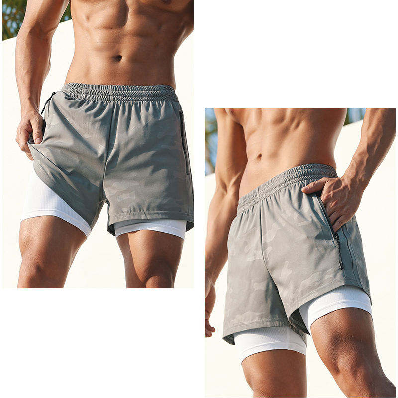 กางเกงขาสั้นออกกำลังกายผู้ชายแบบ 2-in-1 สกรีนโลโก้ได้ ระบายอากาศดี มีซับใน สไตล์วินเทจ เอวยางยืด ไซส์ใหญ่