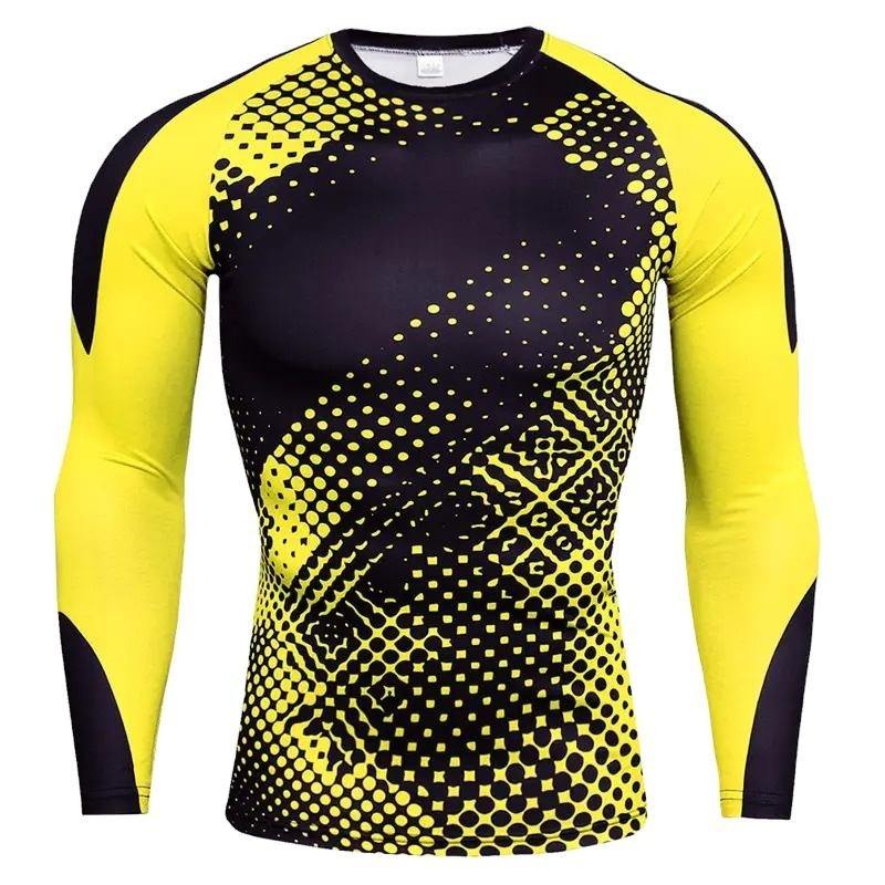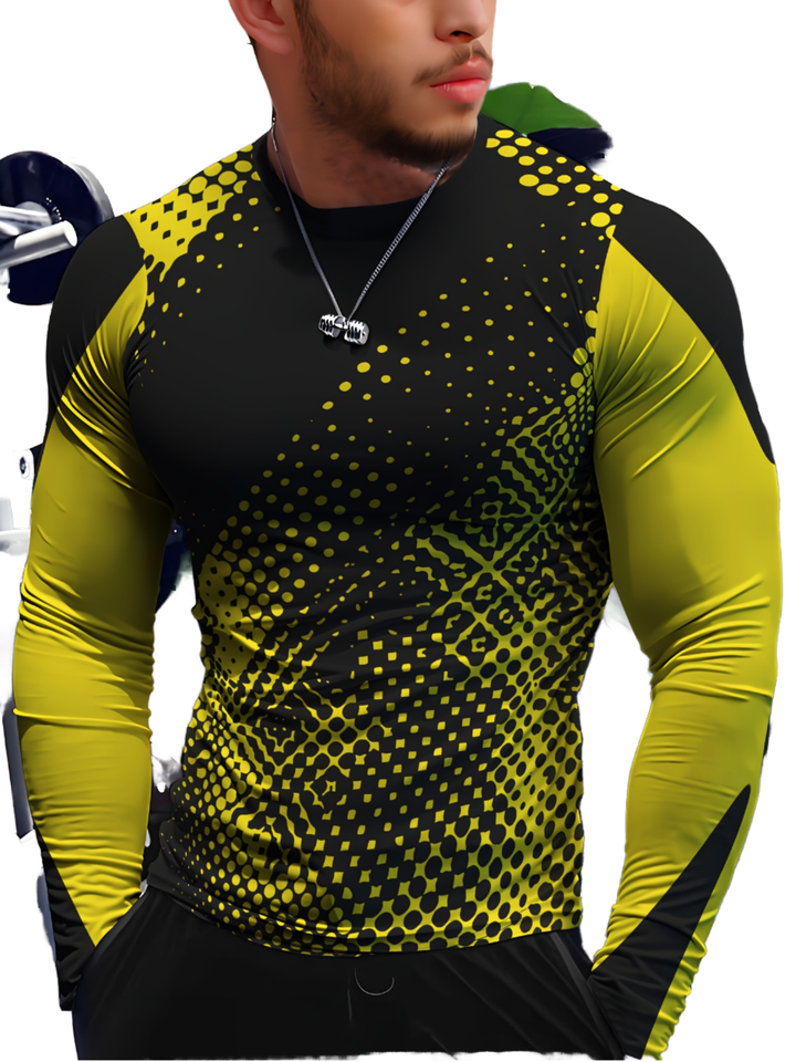 เสื้อรัดกล้ามเนื้อพิมพ์ลายจุดแบบฮาล์ฟโทนสีเหลืองนีออนและสีดำสำหรับผู้ชายพร้อมโลโก้แบบกำหนดเอง เหมาะสำหรับการฝึกซ้อมและการเล่นกีฬา