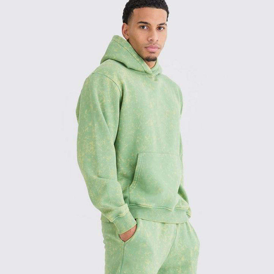 ชุดวอร์มผู้ชายแบบโอเวอร์ไซส์ พิมพ์โลโก้ได้ ผ้าฟลีซคอตตอน 100% คุณภาพสูง ล้างสีแบบ Acid Wash เสื้อฮู้ดดี้และกางเกงจ็อกกิ้ง ชุดลำลองสำหรับผู้ชาย