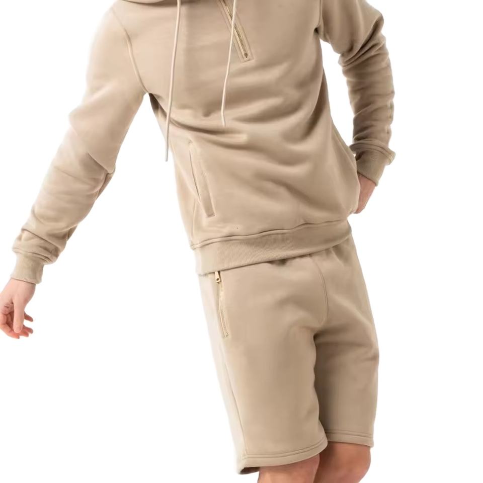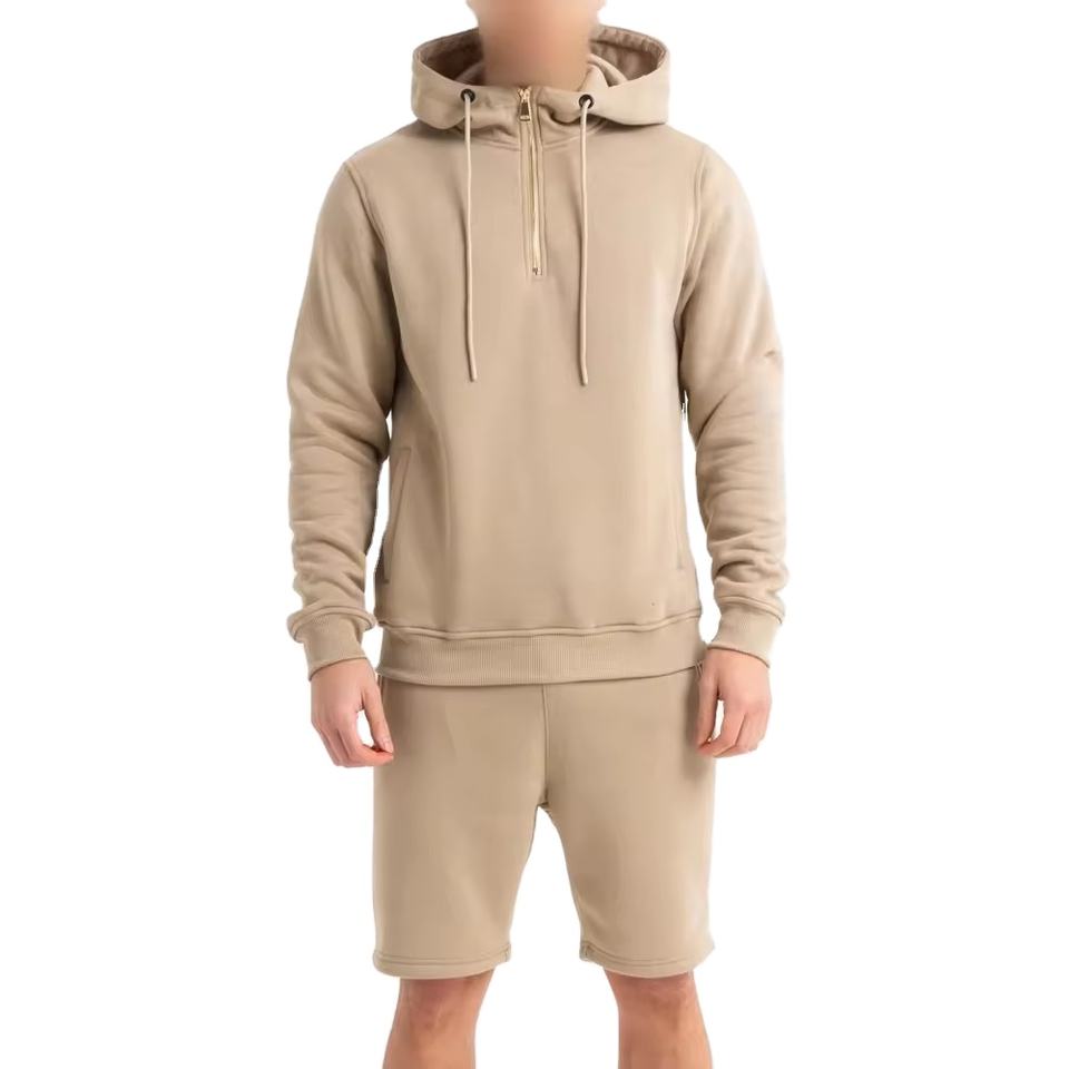ชุดเซ็ตเสื้อฮู้ดแขนสั้นและกางเกงขาสั้นผู้ชาย พิมพ์โลโก้ได้ คุณภาพสูง ผ้าฝ้ายฟลีซ 100% ชุดวอร์มสำหรับผู้ชาย