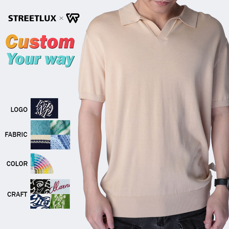 เสื้อสเวตเตอร์ถักสำหรับผู้ชายเสื้อแจ็คการ์ดแขนสั้นทรงหลวมมีปกคอกลมผ้าสีกากีสีทึบโลโก้ออกแบบได้ตามต้องการ