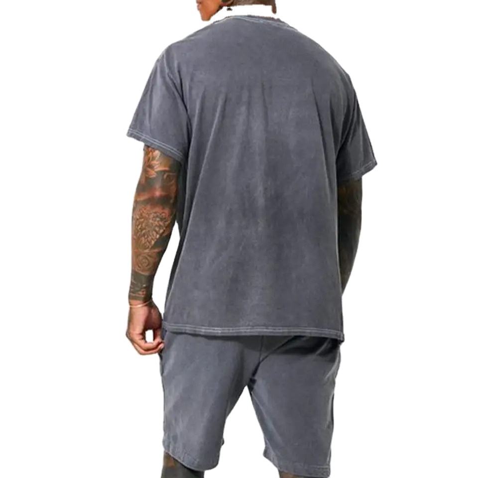ชุดเซ็ตเสื้อยืดและกางเกงขาสั้นผู้ชาย พิมพ์โลโก้ได้ ผ้าเจอร์ซีย์คอตตอน ล้างสีแบบ Acid Wash ชุดกีฬาสองชิ้นสำหรับผู้ชาย