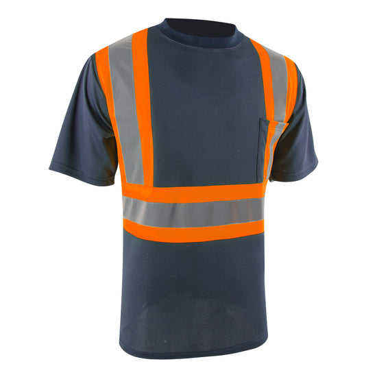 เสื้อทำงานแขนสั้นผู้ชายแบบสะท้อนแสง สีเหลือง/สีส้ม มีโลโก้สั่งทำพิเศษ มีกระเป๋าสะท้อนแสง ผลิตในปากีสถาน