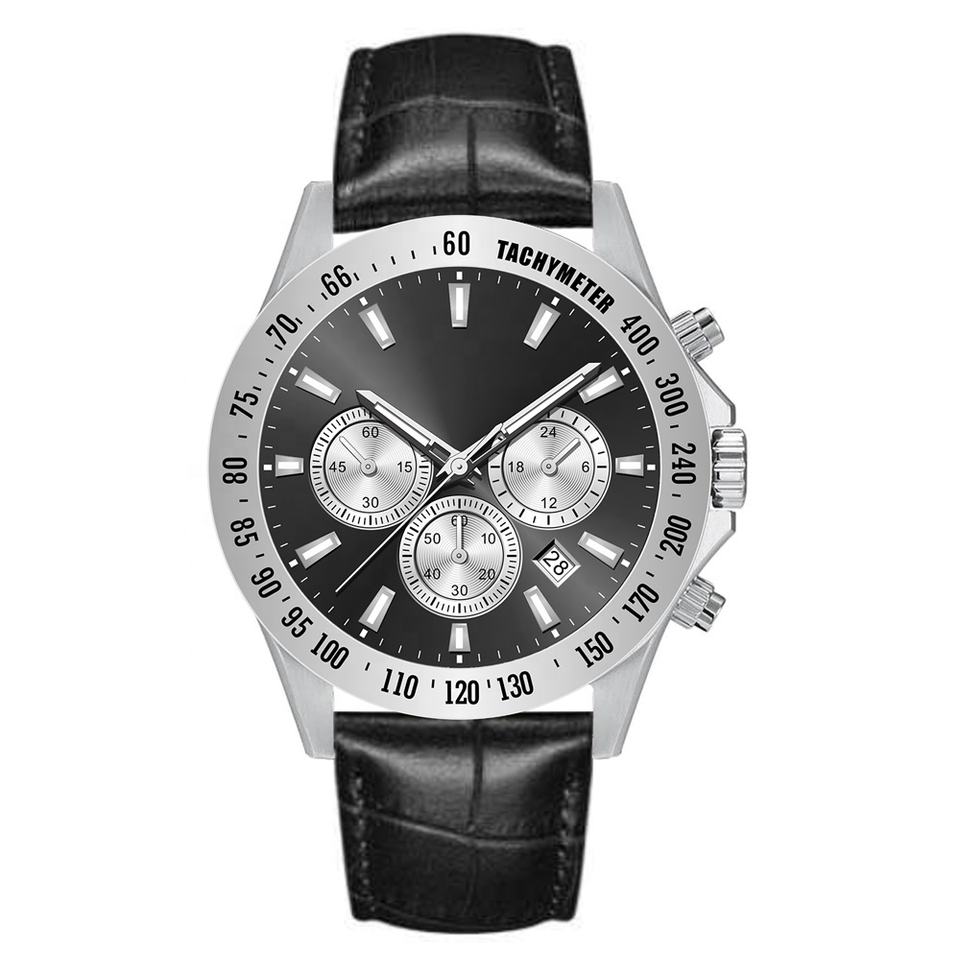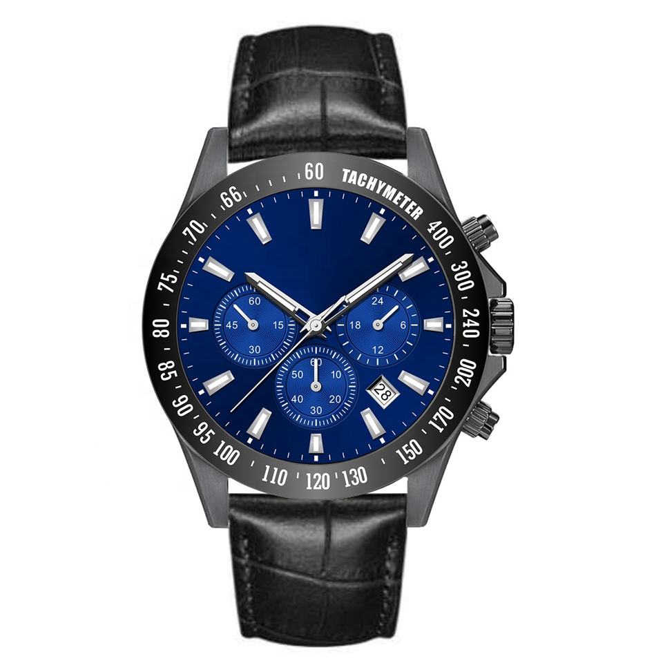นาฬิกาควอตซ์สายหนังสแตนเลสสตีลหรูหราสำหรับผู้ชายเส้นผ่านศูนย์กลางหน้าปัด43มม. โลโก้ที่กำหนดเอง ODM มัลติฟังก์ชั่นนาฬิกาควอตซ์