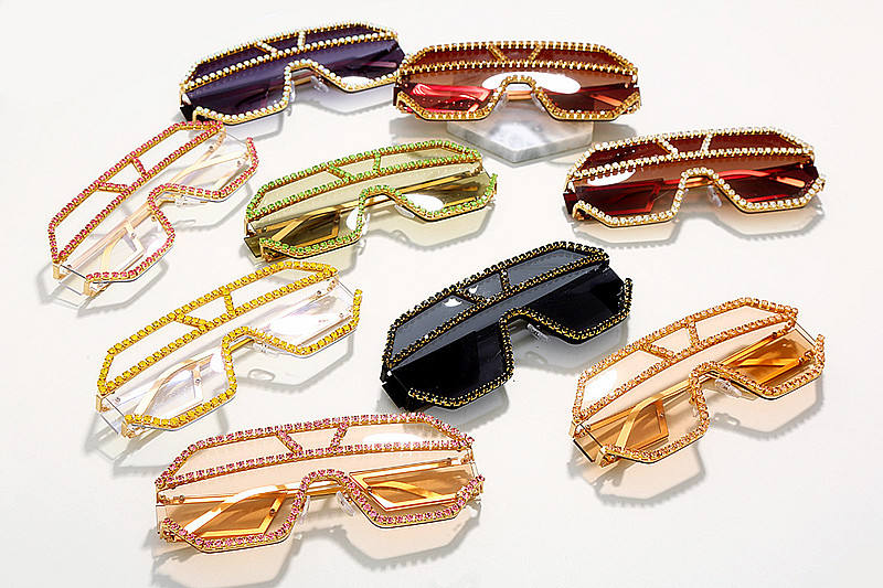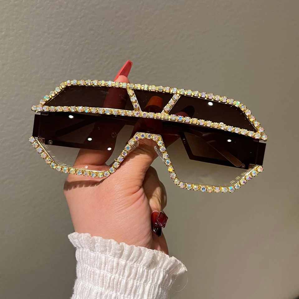 แว่นกันแดดแฟชั่นใหม่ทรงโลโก้แบบกำหนดเอง เลนส์ชิ้นเดียว UV400 ประดับคริสตัลโลหะ แว่นกันแดดคริสตัลขนาดใหญ่สำหรับผู้หญิง