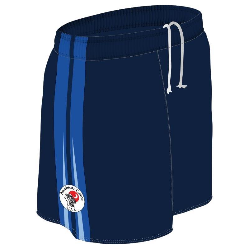 กางเกงขาสั้นสำหรับผู้ชายผู้หญิงพิมพ์โลโก้โพลีเอสเตอร์สีดำแบบซับลิเมชันดีไซน์แบบถักโลโก้ด้านหน้า