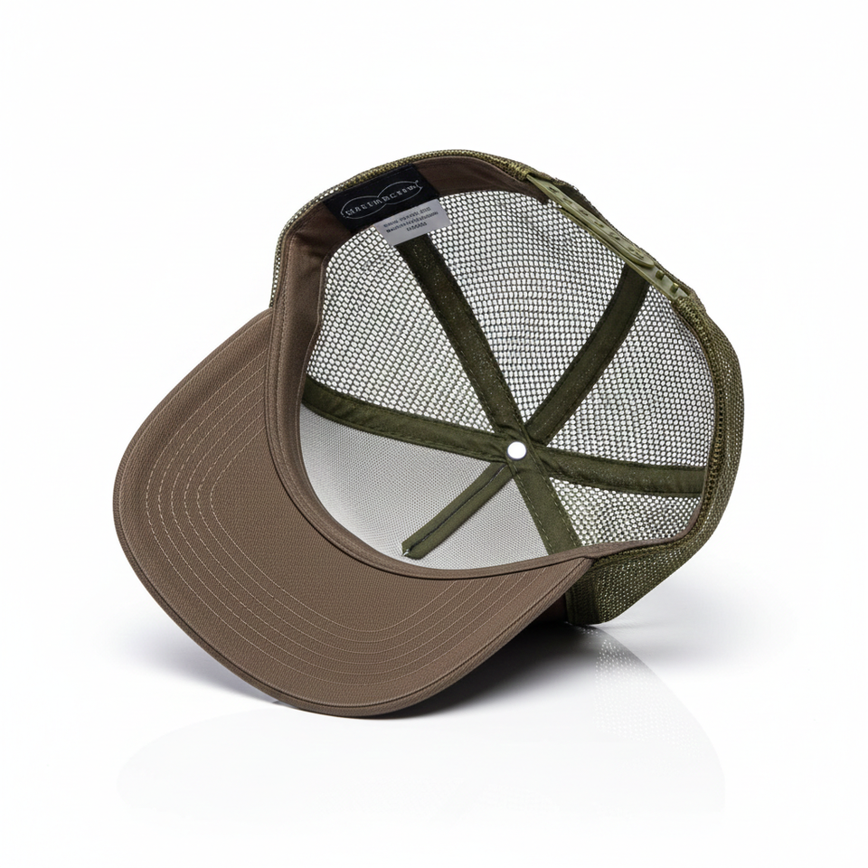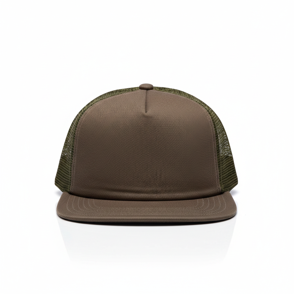 หมวกแก๊ปทรง Trucker สีน้ำตาลมะกอก ปักโลโก้ได้ตามต้องการ ด้านหลังตาข่ายสีเขียว ปรับขนาดได้ ขายส่ง หมวกเปล่า 5 แผง สีเอิร์ธโทน สำหรับกีฬาเบสบอล ผู้ชาย ผู้หญิง