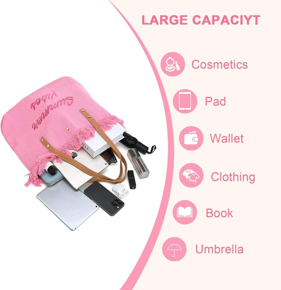 กระเป๋าโท้ทปักลายชายหาดสีชมพูขนาดใหญ่ใส่โลโก้ได้ตามต้องการกระเป๋าสะพายไหล่ทำจากผ้าใบสายหนังสำหรับผู้หญิง