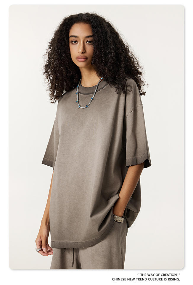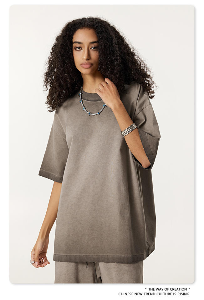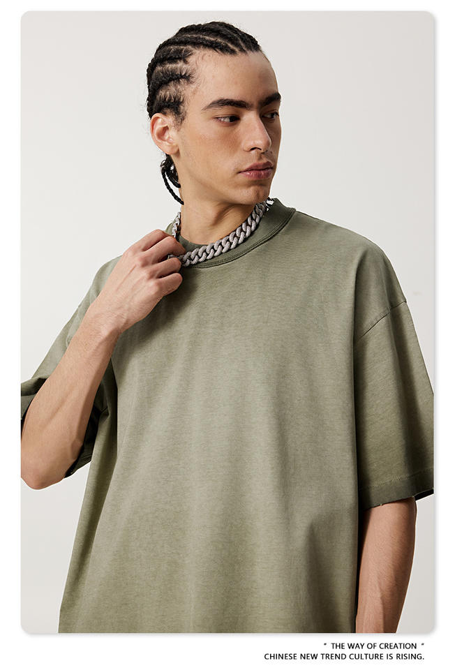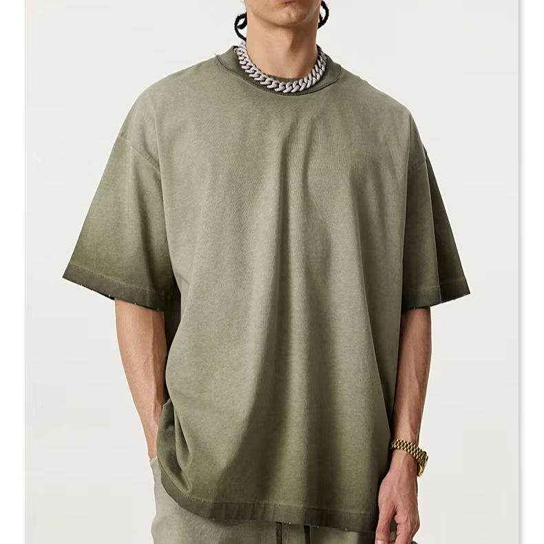 เสื้อยืดแขนสั้นผ้าฝ้ายทรงโอเวอร์ไซส์ปักโลโก้ตามสั่ง พร้อมแผ่นผ้าตกแต่งที่ไหล่ ลายบาติกฟอกสีแบบทำเก่า สำหรับผู้ชาย