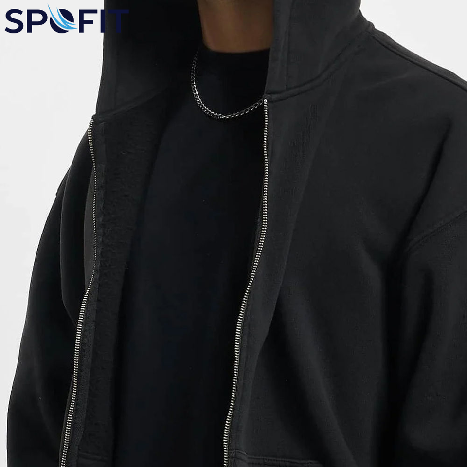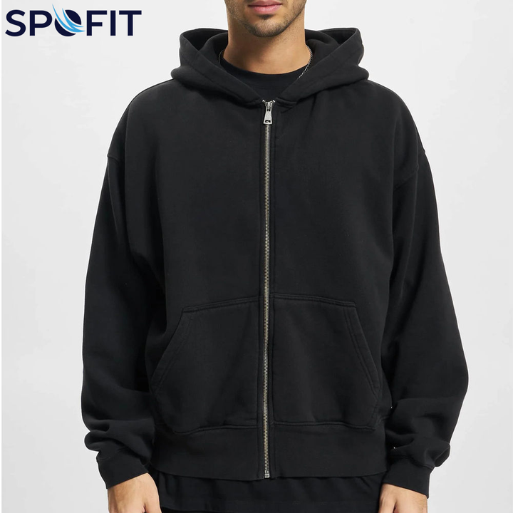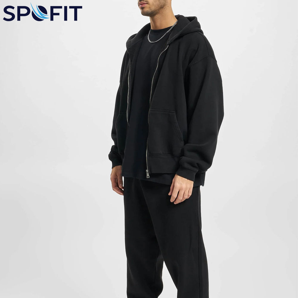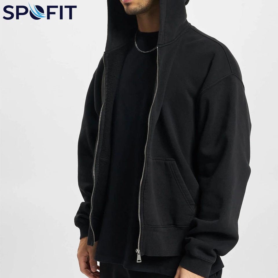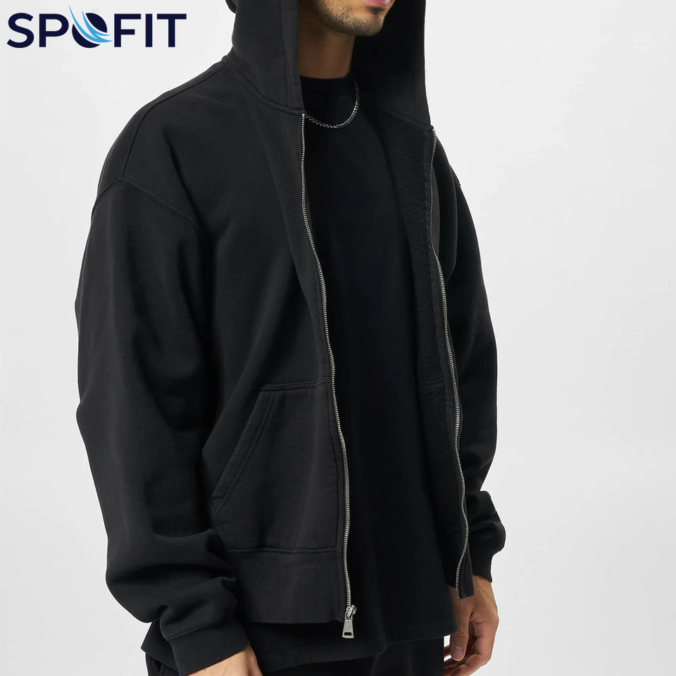 เสื้อฮู้ดซิปโอเวอร์ไซส์ปักโลโก้ตามสั่งสำหรับผู้ชาย เสื้อฮู้ดทรงหลวมแบบซิปเต็มตัว ไหล่ตก ผ้าฝ้ายฟลีซหนานุ่ม สไตล์สตรีทแวร์