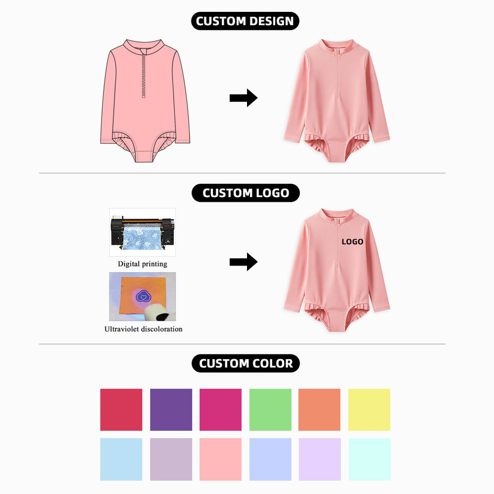 ชุดว่ายน้ำเด็กทารกพิมพ์ลายโลโก้ตามสั่ง ผลิตจากโรงงาน MOQ ต่ำ ชุดว่ายน้ำเด็กแขนยาวสำหรับสวนน้ำ