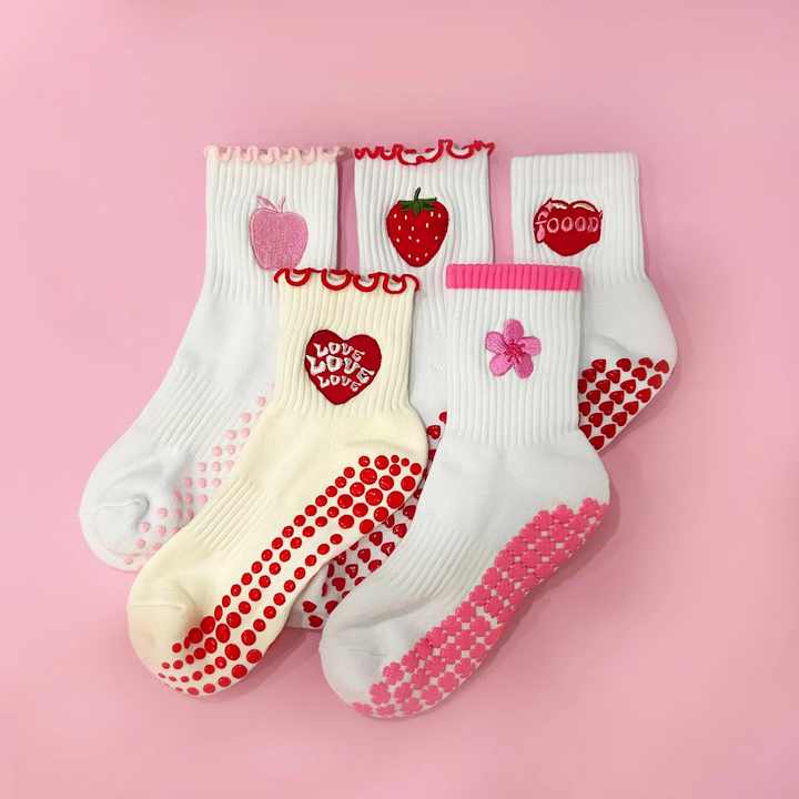 ถุงเท้าพิลาทิสกันลื่นแบบเต็มพื้น ลายหัวใจจุดๆ สีชมพูพาสเทล ผลไม้ สำหรับผู้หญิงและเด็ก รับทำโลโก้ตามสั่ง ขายส่ง