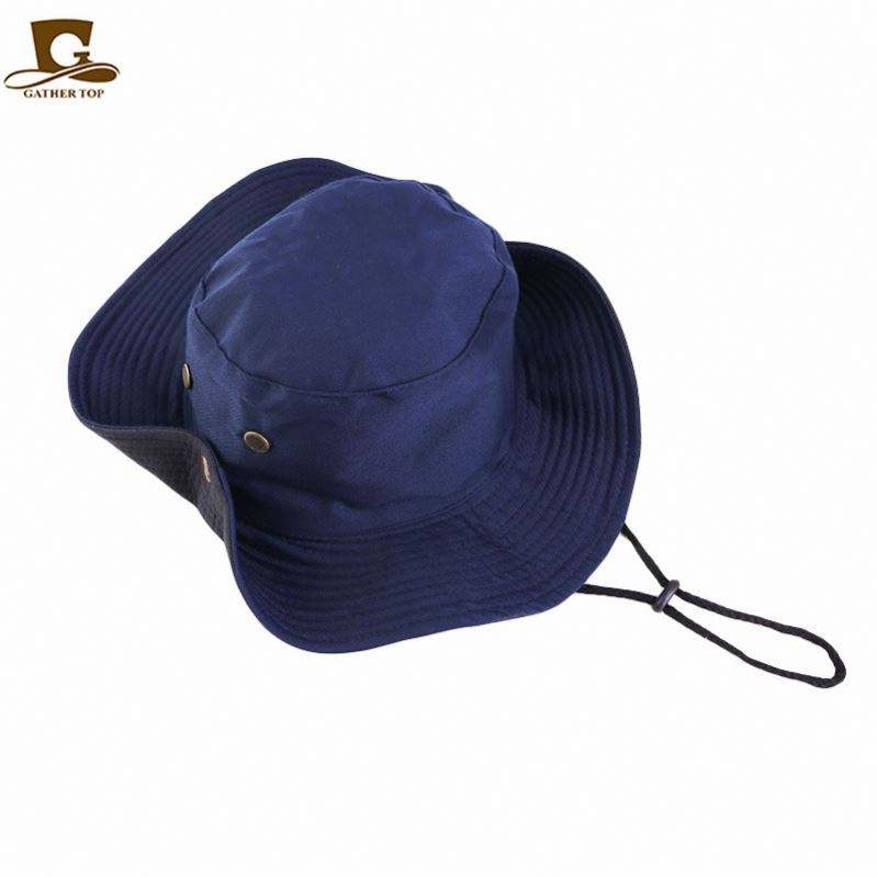 หมวกปีกกว้างสำหรับตกปลาสำหรับผู้ชายหมวกทรงถังพร้อมเชือกผูกกันแดดทำจากผ้าฝ้ายธรรมดาโลโก้ออกแบบได้ตามต้องการ