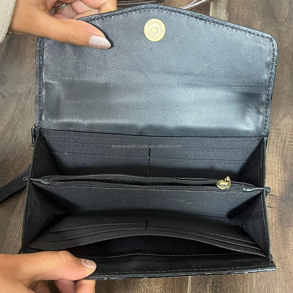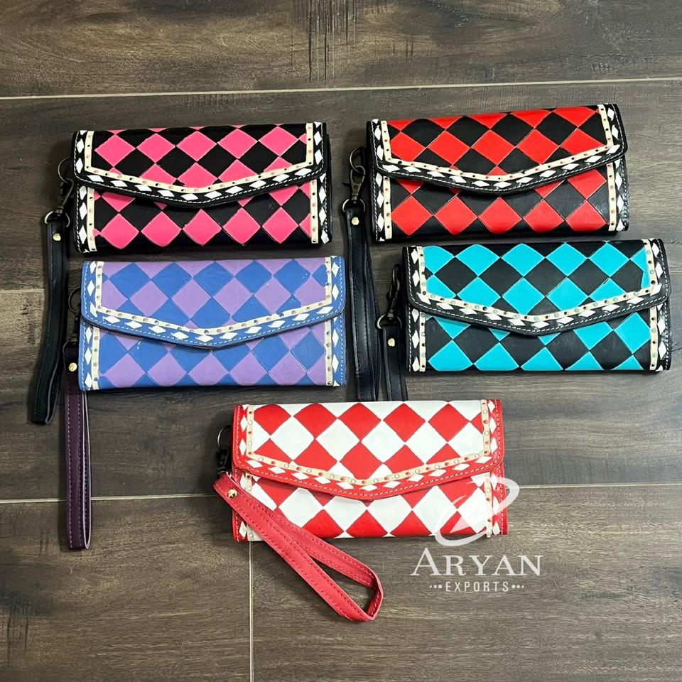 กระเป๋าสตางค์คล้องมือหนังลายตารางหมากรุกทำมือ