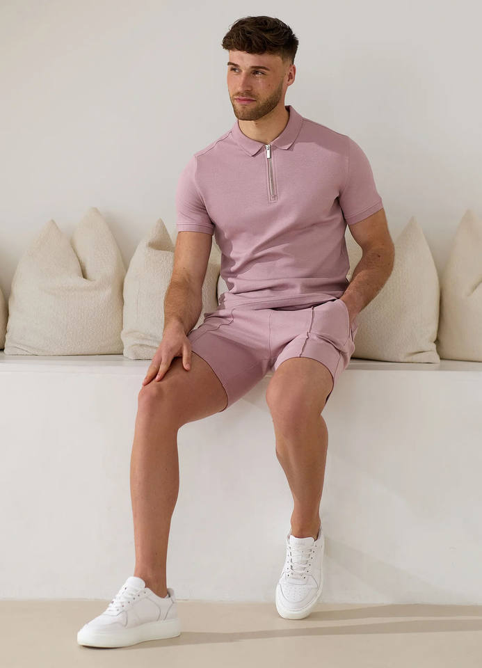 ชุดเสื้อโปโลและกางเกงขาสั้นของผู้ชายชุดออกกำลังกายยิมและชุดออกกำลังกายชายหาดและสตรีทฟิตเนส2ชิ้นสีชมพูเข้มโลโก้ตามสั่ง