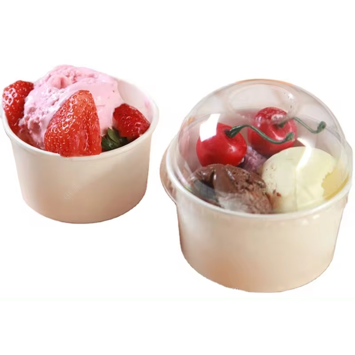 ถ้วยไอศกรีมกระดาษทรงกลมแบบใช้แล้วทิ้งพร้อมฝาปิดพิมพ์โลโก้ที่เป็นมิตรกับสิ่งแวดล้อมและรีไซเคิลได้