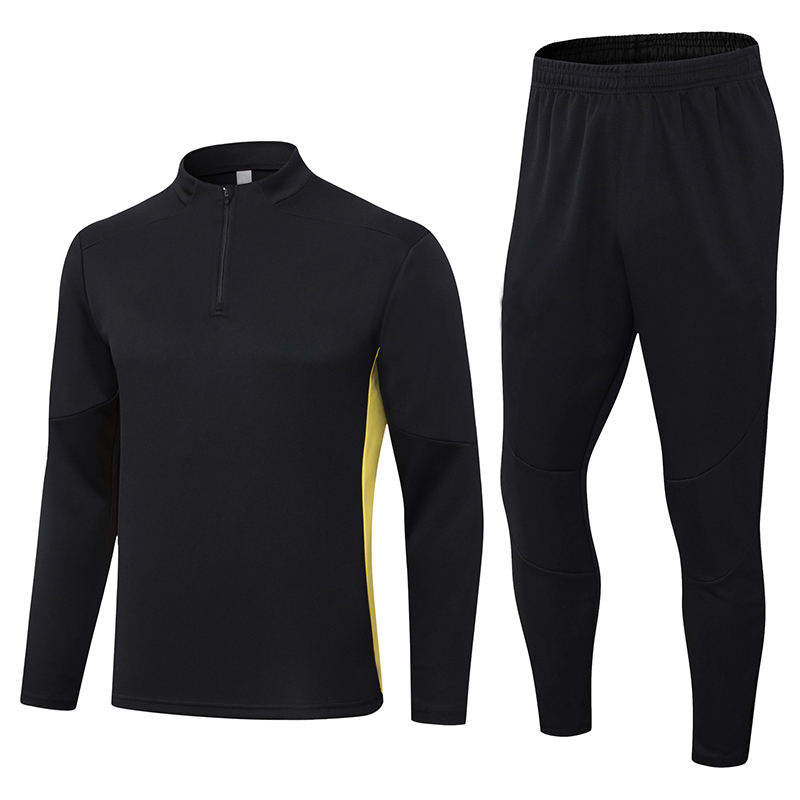 ชุดวอร์มฟุตบอลชายพิมพ์โลโก้ตามสั่ง แขนสั้น สีเหลือง ซิป ¼ ระบายอากาศได้ดี กางเกงทรงเข้ารูป ชุดสำหรับฝึกซ้อม