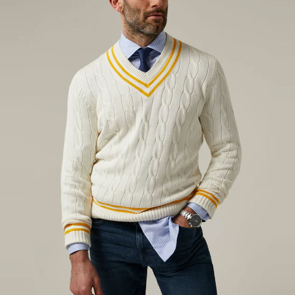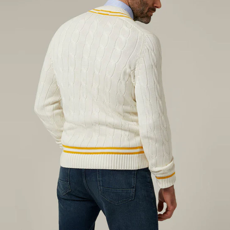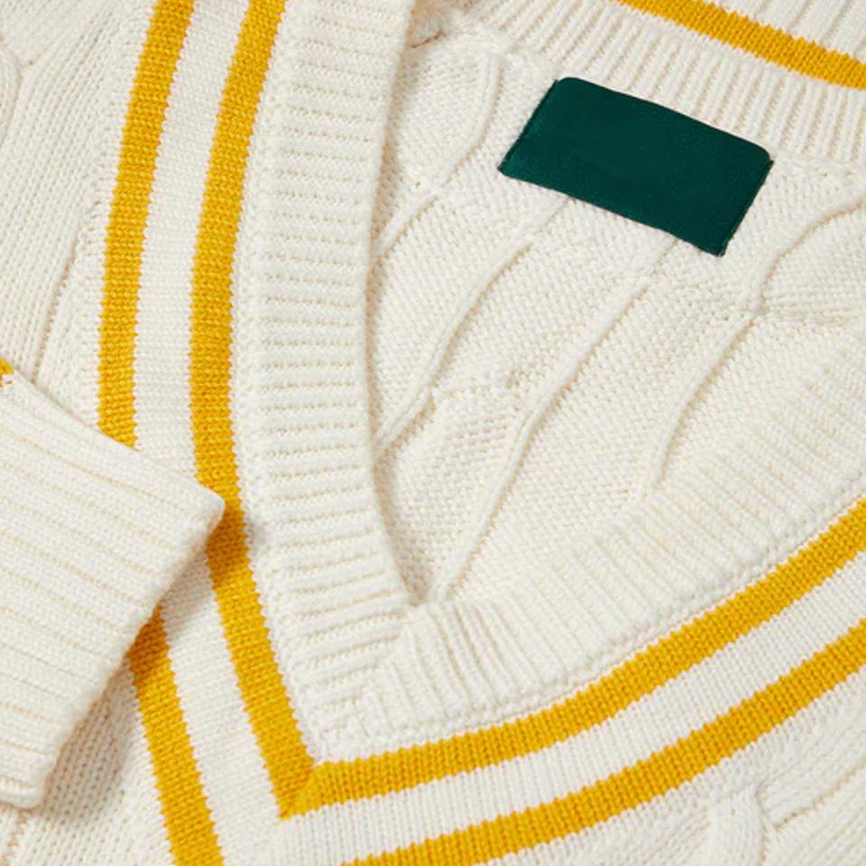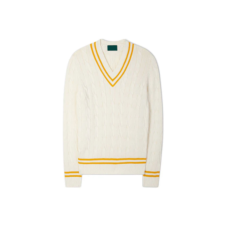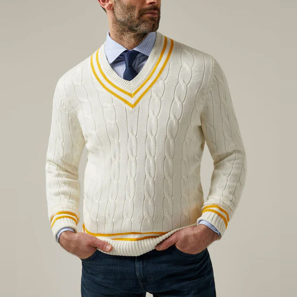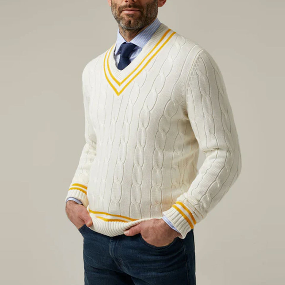 เสื้อสเวตเตอร์ถักคอวีแขนยาวสำหรับผู้ชายเสื้อถักลายโลโก้แบบถักสำหรับเล่นคริกเก็ตฤดูหนาว