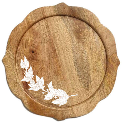 จานไม้มะม่วงพิมพ์โลโก้ตามสั่ง สไตล์ฟาร์มเฮาส์ สำหรับตกแต่งโต๊ะอาหาร จานเสิร์ฟไม้ธรรมชาติทรงกลมสำหรับจัดเลี้ยง (OEM)
