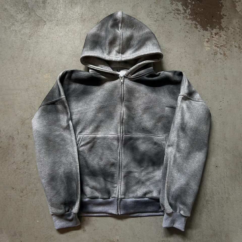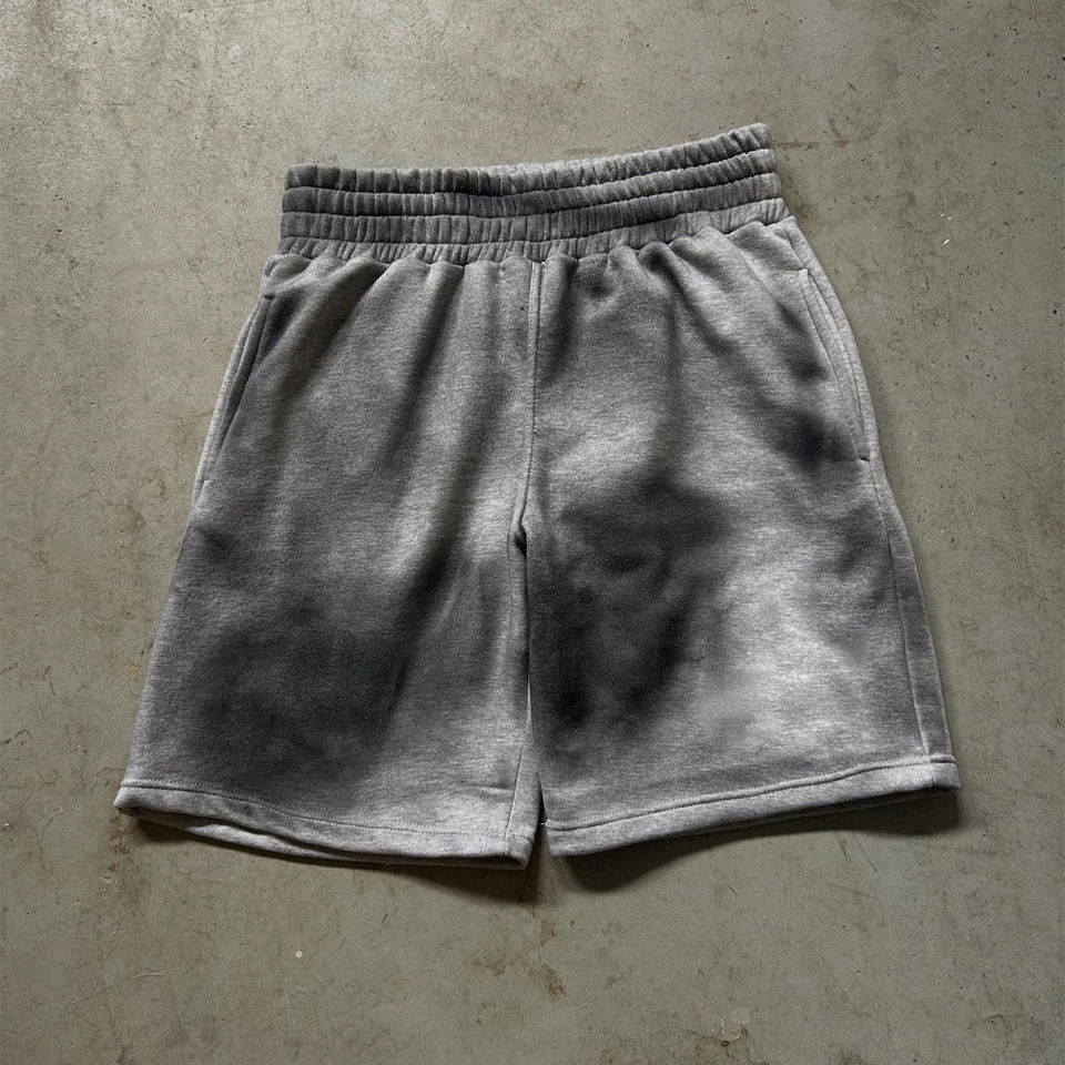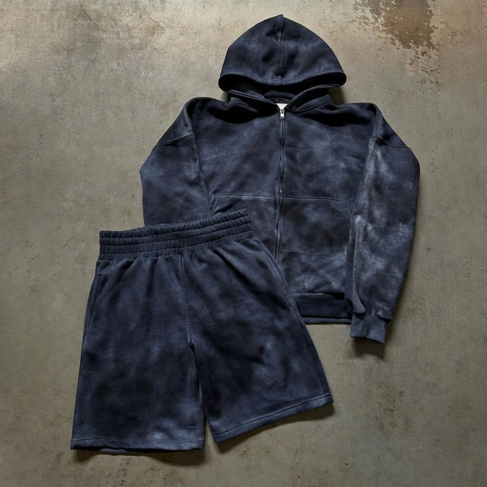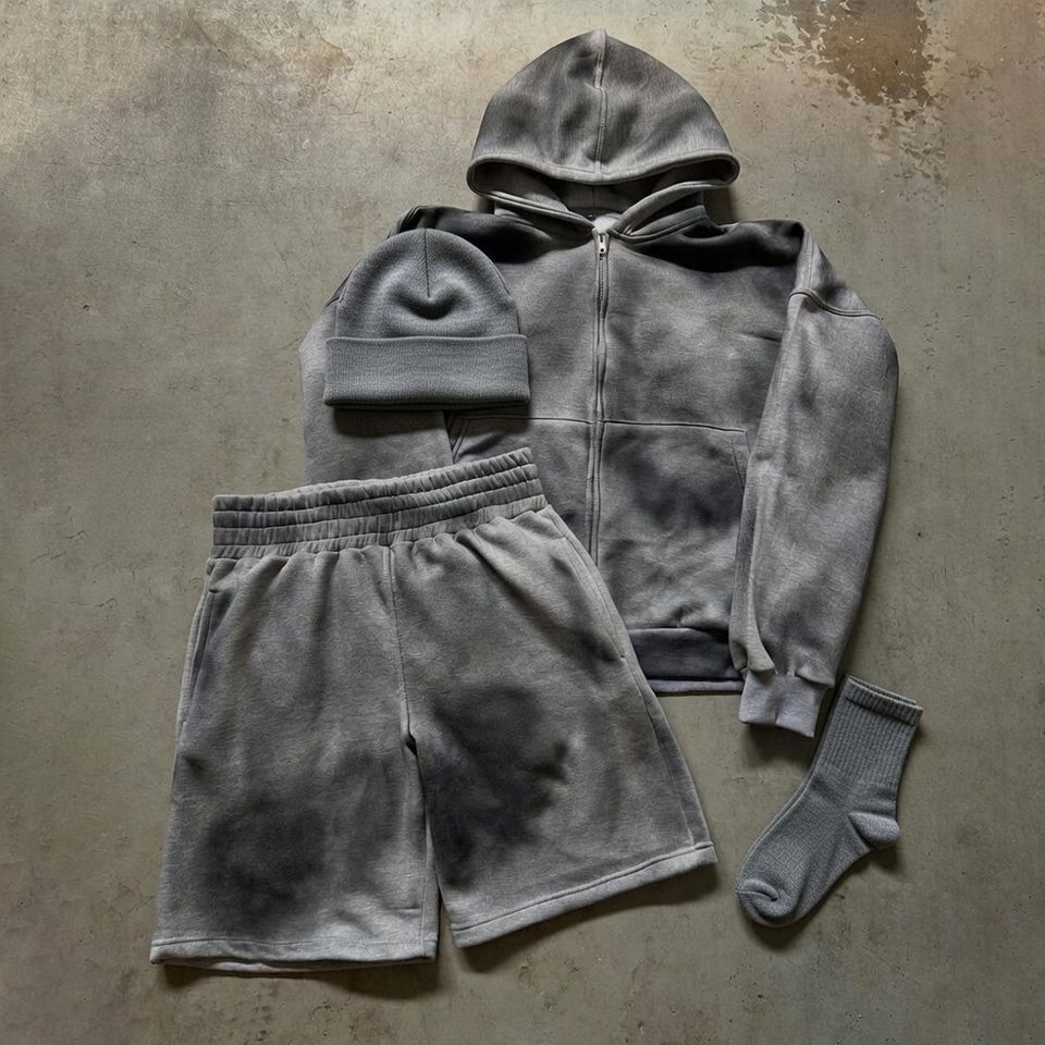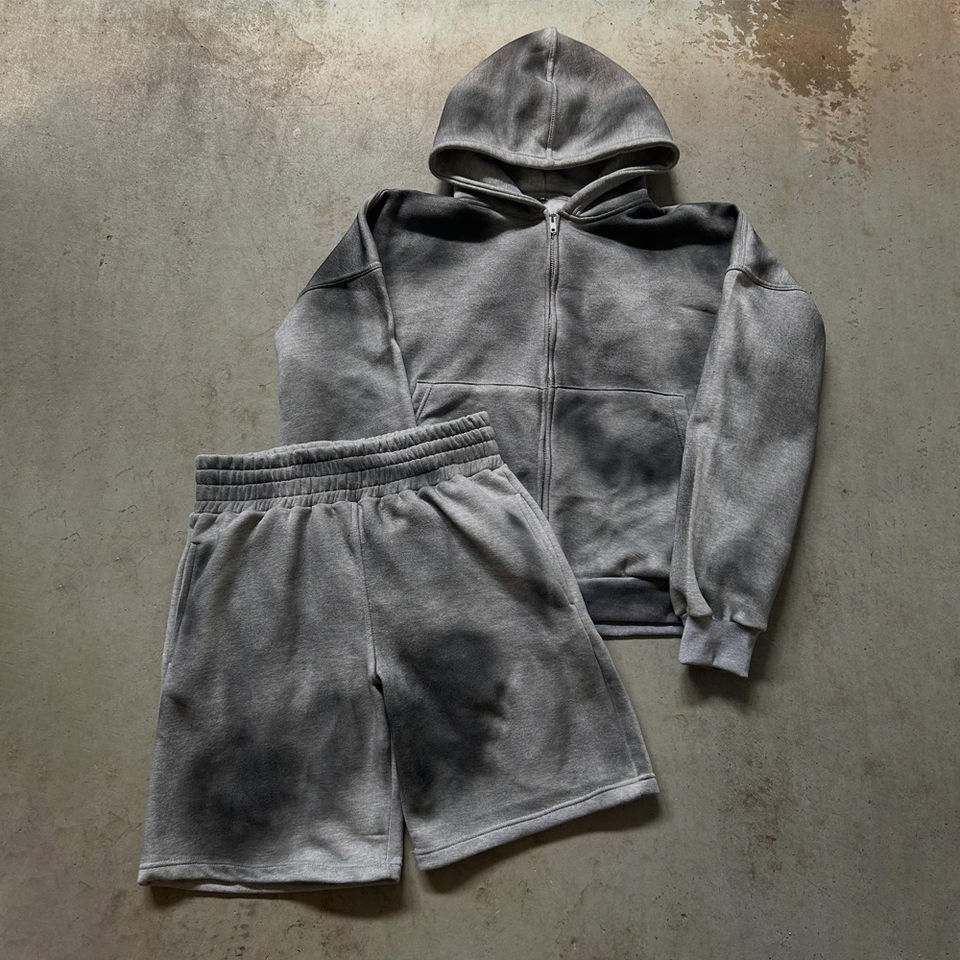 ชุดฮู้ดดี้และกางเกงขาสั้นพิมพ์ลายโลโก้แบบกำหนดเอง สไตล์เรโทรซันเฟด ผ้าฟลีซลำลอง 100% คอตตอน ชุดฮู้ดดี้และกางเกงขาสั้นแบบย้อมสีเอซิด สำหรับทุกเพศ